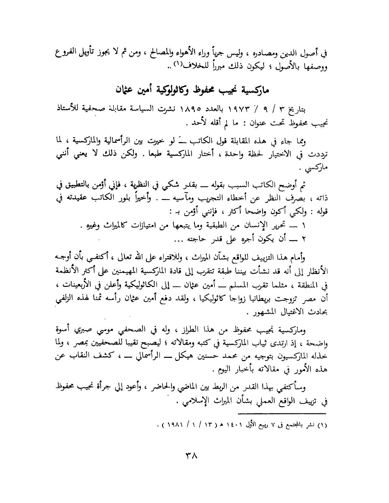 مَارْكْسِيَّةُ نَجِيبْ مَحْفُوظْ وَكَاثُولِيكِيَّةُ أَمِينْ عُثْمَانْ: