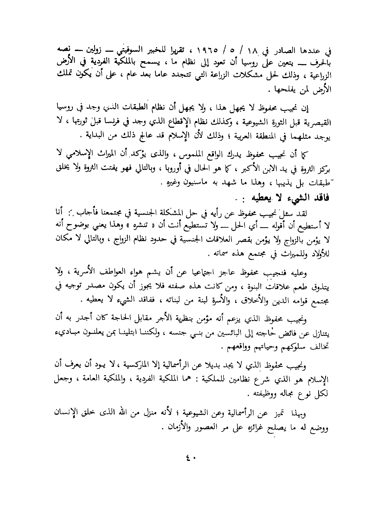 إن نجيب محفوظ لا يجهل هذا، ولا يجهل أن نظام الطبقات الذي وجد في روسيا القيصرية قبل الثورة الشيوعية، وكذلك نظام الإقطاع الذي وجد في فرنسا قبل ثورتها، لا يوجد مثلهما في المنطقة العربية، وذلك لأن الإسلام قد عالج ذلك من البداية.