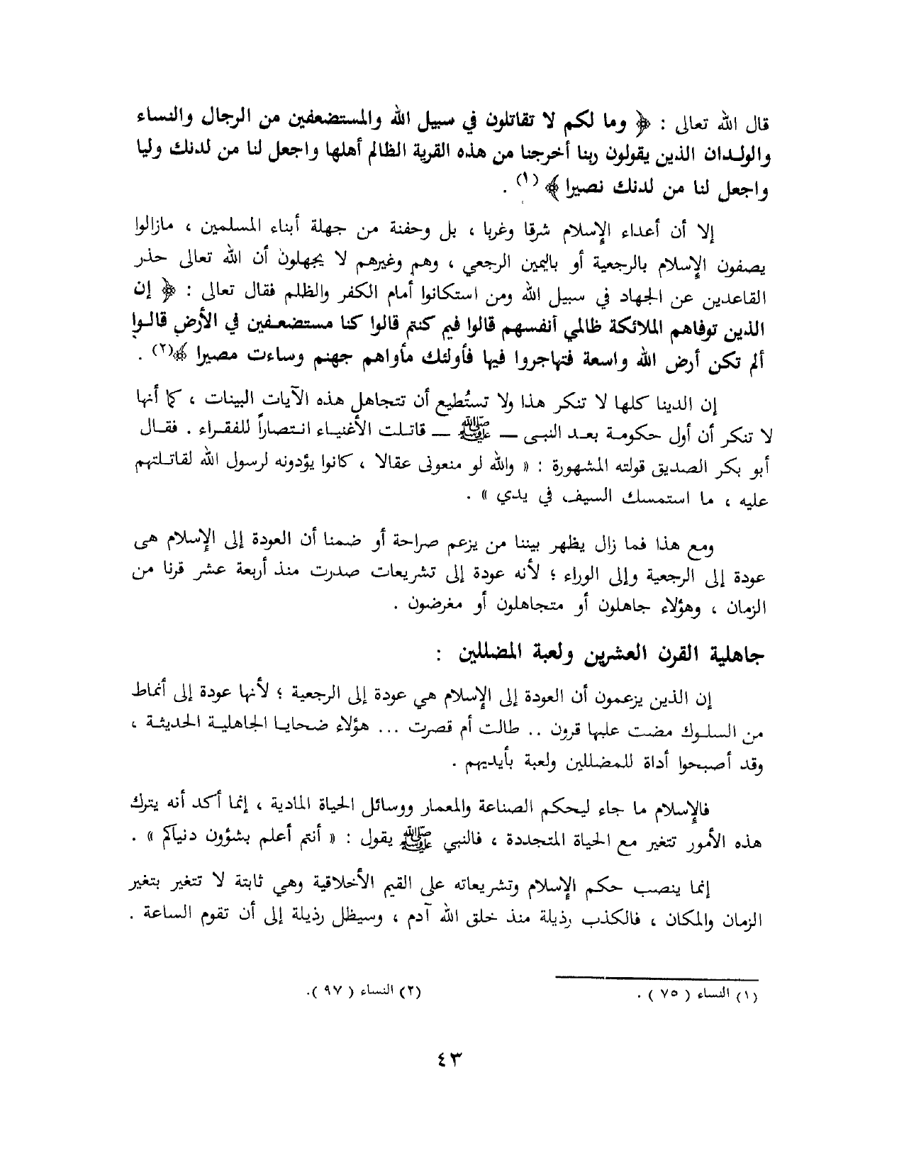 إلا أن أعداء الإسلام شرقًا وغربًا من جهلة أبناء المسلمين، مازالوا يصفون الإسلام بالرجعية أو باليمين الرجعي، وهو وغيرهم لا يجهلون أن الله تعالى حذر القاعدين عن الجهاد في سبيل الله ومن استكانوا أمام الكفر والظلم، فقال تعالى: {إِنَّ الَّذِينَ تَوَفَّاهُمُ الْمَلاَئِكَةُ ظَالِمِي أَنْفُسِهِمْ قَالُوا فِيمَ كُنْتُمْ قَالُوا كُنَّا مُسْتَضْعَفِينَ فِي الأَرْضِ قَالُوا أَلَمْ تَكُنْ أَرْضُ اللَّهِ وَاسِعَةً فَتُهَاجِرُوا فِيهَا فَأُولَئِكَ مَأْوَاهُمْ جَهَنَّمُ وَسَاءَتْ مَصِيرًا} (¬2).