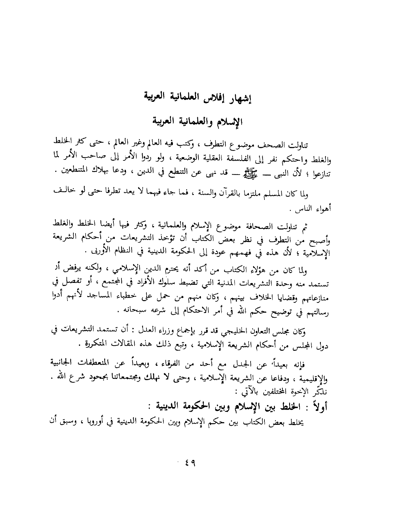 ثم تناولت الصحافة موضوع الإسلام والعلمانية، وكثر فيها أيضًا الخلط والغلط وأصبح من التطرف في نظر بعض الكُتَّابِ أن تؤخذ التشريعات من أحكام الشريعة الإسلامية؛ لأن هذه في فهمهم عودة إلى الحكومة الدينية في النظام الأوروبي.