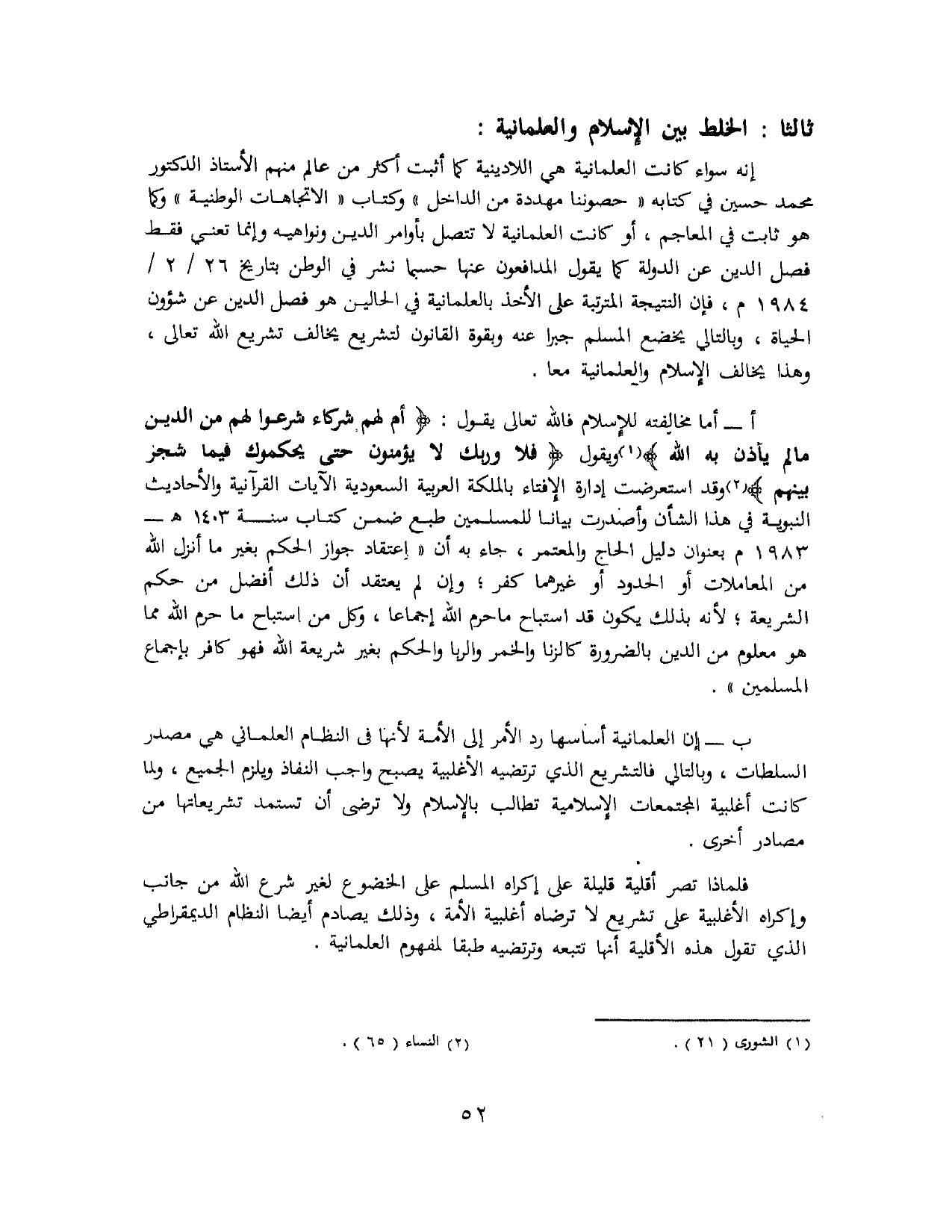 إنه سواءً كانت العلمانية هي اللادينية كما أثبت أكثر من عالم منهم الأستاذ محمد محمد حسين في كتابه " حصوننا مهددة من داخلها " وكتاب " الاتجاهات الوطنية " وكما هو ثابت في المعاجم، أو كانت العلمانية لا تتصل بأوامر الدين ونواهيه وإنما تعني فقط فصل الدين عن الدولة كما يقول المدافعون عنها حسبما نشر في " الوطن " بتاريخ 26/ 2 / 1984 م، فإن النتيجة المترتبة على الأخذ بالعلمانية في الحالين هو فصل الدين عن شؤون الحياة، وبالتالي يخضع المسلم جبرًا عنه وبقوة القانون لتشريع يخالف تشريع الله تعالى، وهذا يخالف الإسلام والعلمانية مَعًا.