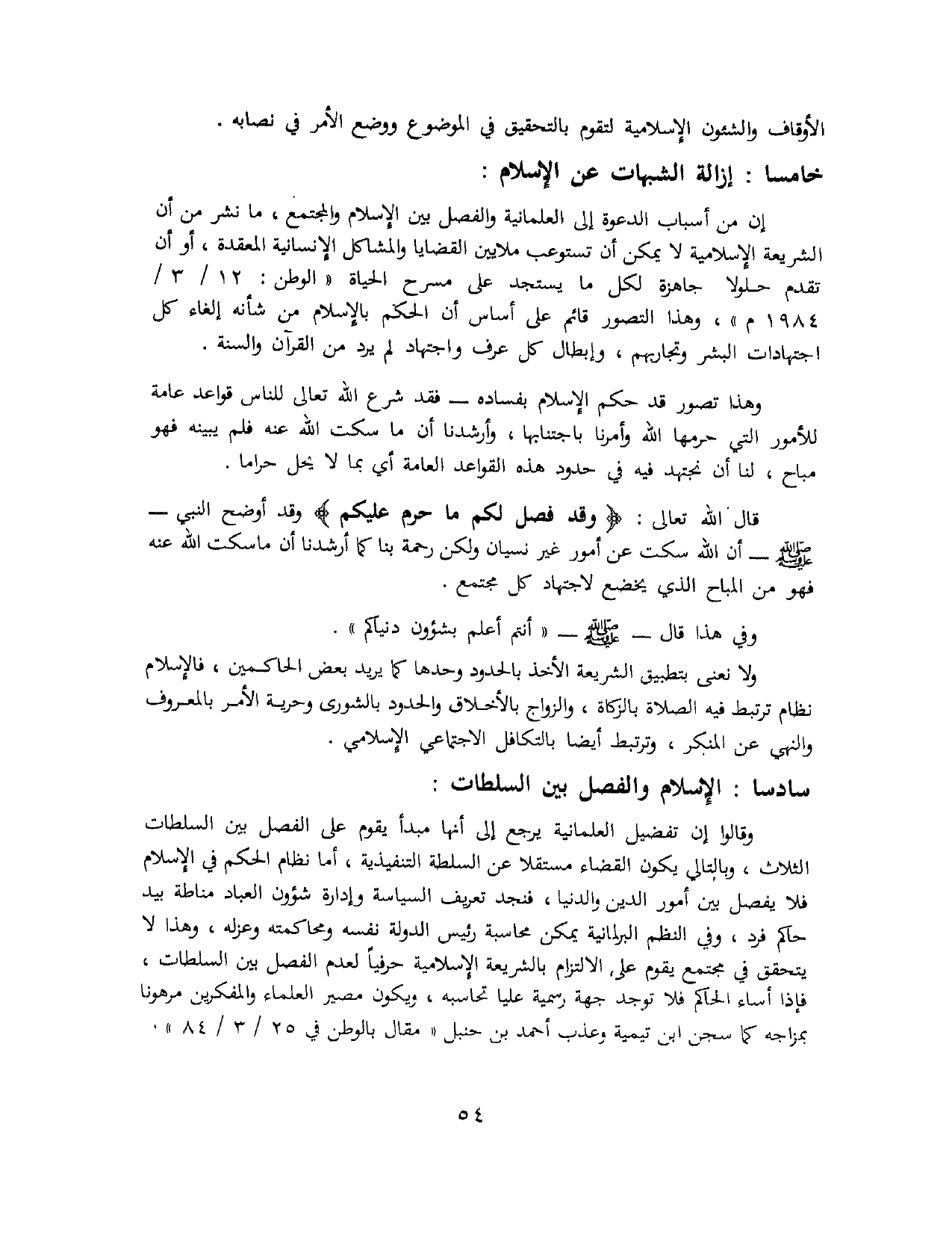 «إِنَّ مِنْ أَسْبَابِ الدَّعْوَةِ إِلَى العِلْمَانِيَّةِ وَالفَصْلِ بَيْنَ الإِسْلاَمِ وَالمُجْتَمَعِ، مَا نُشِرَ مِنْ أَنَّ الشَّرِيعَةَ الإِسْلاَمِيَّةَ لاَ يُمْكِنُ أَنْ تَسْتَوْعِبَ مَلاَيِينَ القَضَايَا وَالمَشَاكِلِ الإِنْسَانِيَّةِ المُعَقَّدَةِ، أَوْ أَنْ تُقَدِّمَ حُلُولاً جَاهِزَةً لَكُلِّ مَا يَسْتَجِدُّ عَلَى مَسْرَحِ الحَيَاةِ» (" الوطن ": 12/ 3 / 1984 م)، وهذا التصور قائم على أساس أن الحكم بالإسلام من شأنه إلغاء كل اجتهادات البشر وتجاربهم، وإبطال كل عرف واجتهاد لم يرد من القرآن والسنة.