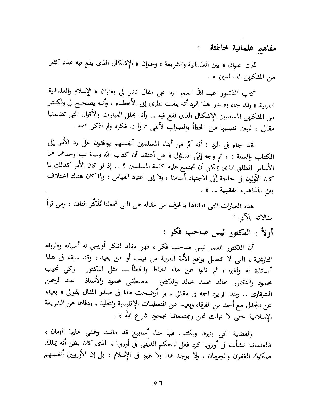 أن الدكتور العُمُرْ ليس صاحب فكر، فهو مقلد لفكر أوروبي له أسبابه وظروفه التاريخية، التي لا تتصل بواقع الأمة العربية من قريب أو من بعيد، وقد سبقه في هذا أساتذة له ولغيره، ثم تابوا عن هذا الخلط والخطأ - مثل الدكتور زكي نجيب محمود، والدكتور خالد محمد خالد، والدكتور مصطفى محمود، والأستاذ عبد الرحمن الشرقاوي .. ولهذا لم يرد اسمه في مقالي، بل أوضحت هذا في صدر المقال بقولي: «بَعِيدًا عَنْ الجَدَلِ مَعَ أَحَدٍ مِنَ الفُرَقَاءِ وَبَعِيدًا عَنْ المُنْعَطَفَاتِ الإِقْلِيمِيَّةِ وَالمَحَلِّيَّةِ، وَدِفَاعًا عَنْ الشَّرِيعَةِ الإِسْلاَمِيَّةِ حَتَّى لاَ نَهْلَكَ نَحْنُ وَمُجْتَمَعَاتُنَا بِجُحُودِ شَرْعِ اللهِ».
