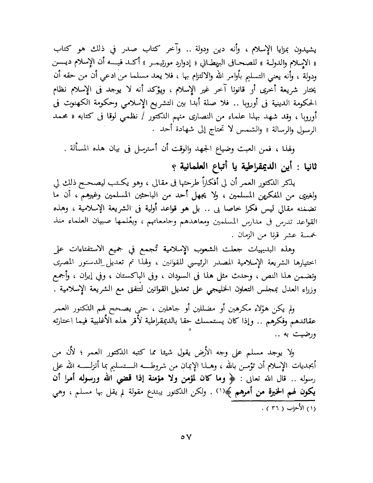 ولا يوجد مسلم على وجه الأرض يقول شيئًا مما كتبه الدكتور العمر؛ لأن من أبجديات الإسلام أن تؤمن بالله، وهذا الإيمان من شروطه التسليم بما أنزله اللهُ على رسوله .. قَالَ اللهُ تَعَالَى: {وَمَا كَانَ لِمُؤْمِنٍ وَلاَ مُؤْمِنَةٍ إِذَا قَضَى اللَّهُ وَرَسُولُهُ أَمْرًا أَنْ يَكُونَ لَهُمُ الْخِيَرَةُ مِنْ أَمْرِهِمْ} (¬1). ولكن الدكتور العمر يبتدع مقولة لم يقل بها مسلم، وهي