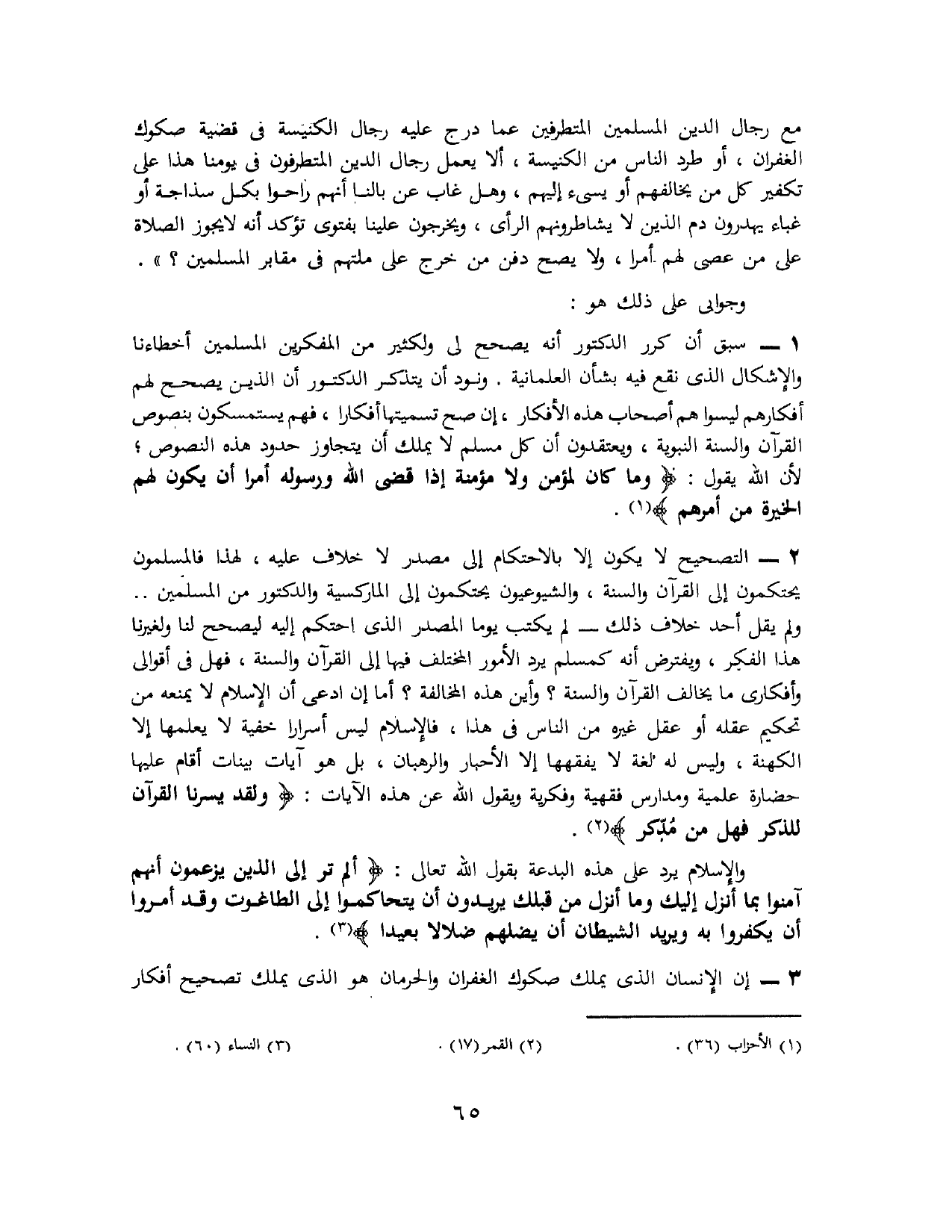 1 - سبق أن كرر الدكتور أنه يصحح لي ولكثير من المفكرين المسلمين أخطاءنا والإشكال الذي نقع فيه بشأن العلمانية. ونود أن يتذكر الدكتور أن الذين يصحح لهم أفكارهم ليسوا هم أصحاب هذه الأفكار، إن صح تسميتها أفكارًا، فهم يستمسكون بنصوص القرآن والسنة النبوية، ويعتقدون أن كل مسلم لا يملك أن يتجاوز حدود هذه النصوص؛ لأن الله يقول: {وَمَا كَانَ لِمُؤْمِنٍ وَلاَ مُؤْمِنَةٍ إِذَا قَضَى اللَّهُ وَرَسُولُهُ أَمْرًا أَنْ يَكُونَ لَهُمُ الْخِيَرَةُ مِنْ أَمْرِهِمْ} (¬1).