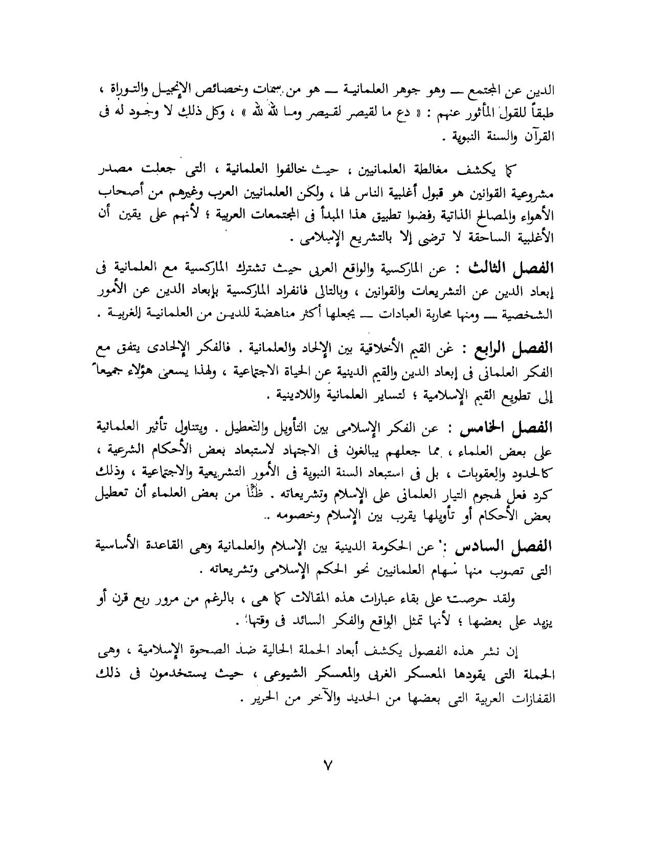 • الفصل السادس: عن الحكومة الدينية بين الإسلام والعلمانية وهي القاعدة الأساسية التي تصوب منها سهام العلمانيين نحو الحكم الإسلامي وتشريعاته.