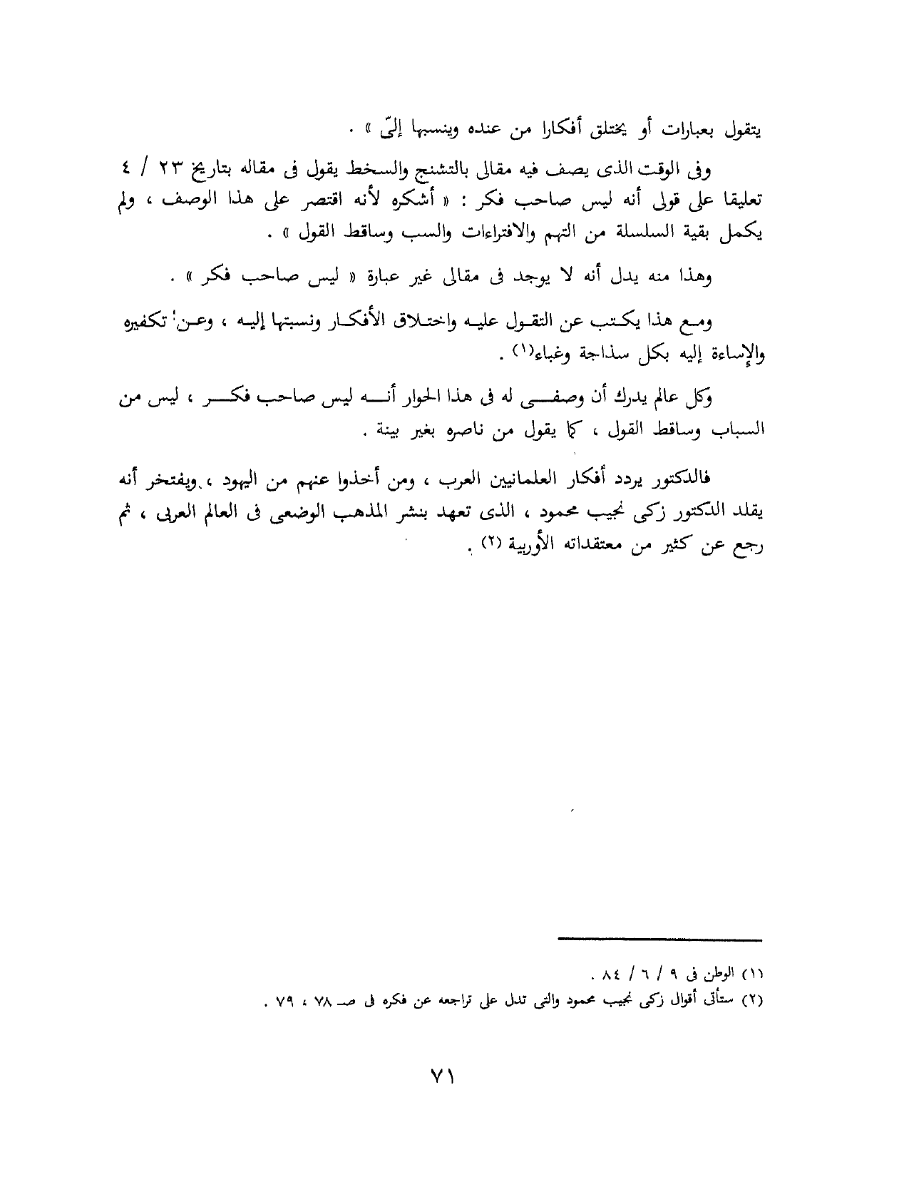 (¬2) ستأتي أقوال زكي نجيب محمود والتي تدل على تراجعه عن فكره في ص 78، 79.