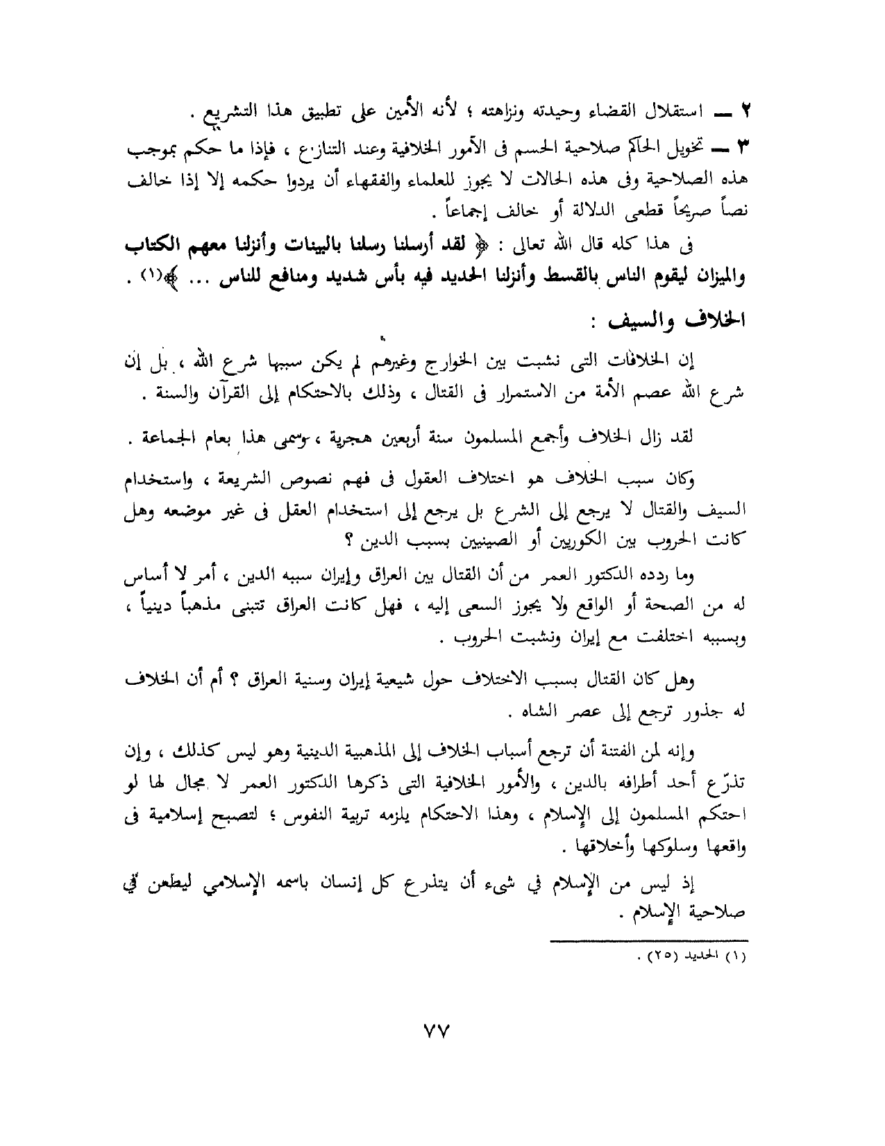 وإنه لمن الفتنة أن ترجع أسباب الخلاف إلى المذهبية الدينية وهو ليس كذلك، وإن تذرع أحد أطرافه بالدين، والأمور الخلافية التي ذكرها الدكتور العمر لا مجال لها ولو احتكم المسلمون إلى الإسلام، وهذا الاحتكام يلزمه تربية النفوس، لتصبح إسلامية في واقعها وسلوكها وأخلاقها، إذ ليس من الإسلام في شيء أن يتذرع كل إنسان باسمه الإسلامي ليطعن في صلاحية الإسلام.