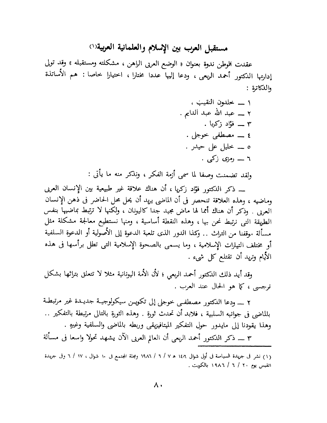 مُسْتَقْبَلُ العَرَبِ بَيْنَ الإِسْلاَمِ وَالعِلْمَانِيَّةِ العَرَبِيَّةِ: (¬1).