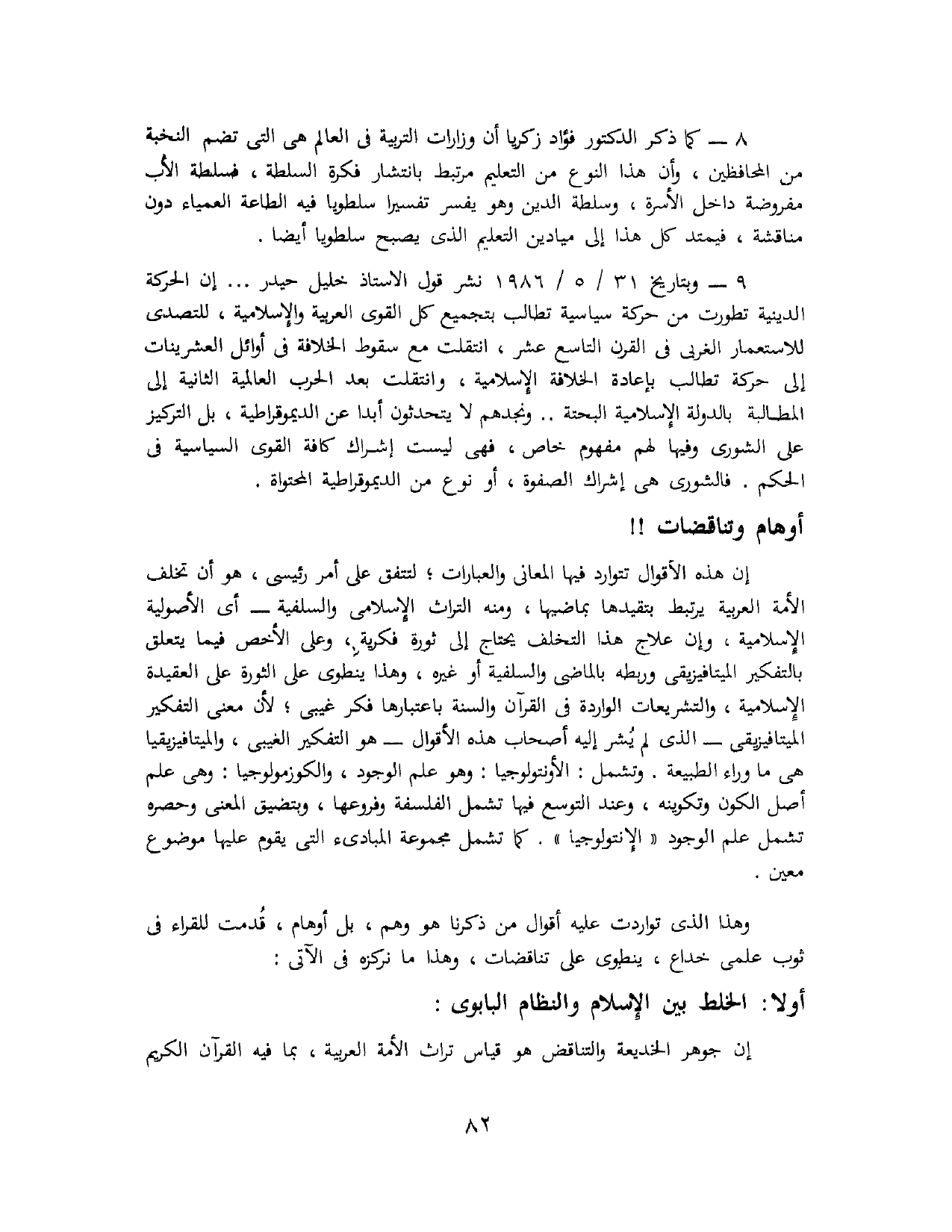 9 - وبتاريخ 31/ 5 / 1986 نشر قول الأستاذ خليل حيدر «... إن الحركة الدينية تطورت من حركة سياسية تطالب بتجميع كل القوى العربية والإسلامية، للتصدي للاستعمار الغربي في القرن التاسع عشر، انتقلت مع سقوط الخلافة في أوائل العشرينات إلى حركة تطالب بإعادة الخلافة الإسلامية، وانتقلت بعد الحرب العالمية الثانية إلى المطالبة بالدولة الإسلامية البحتة .. ونجدهم لا يتحدثون أبدًا عن الديمقراطية، بل التركيز على الشورى وفيها لهم مفهوم خاص، فهي ليست إشراك كافة القوى السياسية في الحكم. فالشورى هي إشراك الصفوة، أو نوع من الديمقراطية المحتواة».