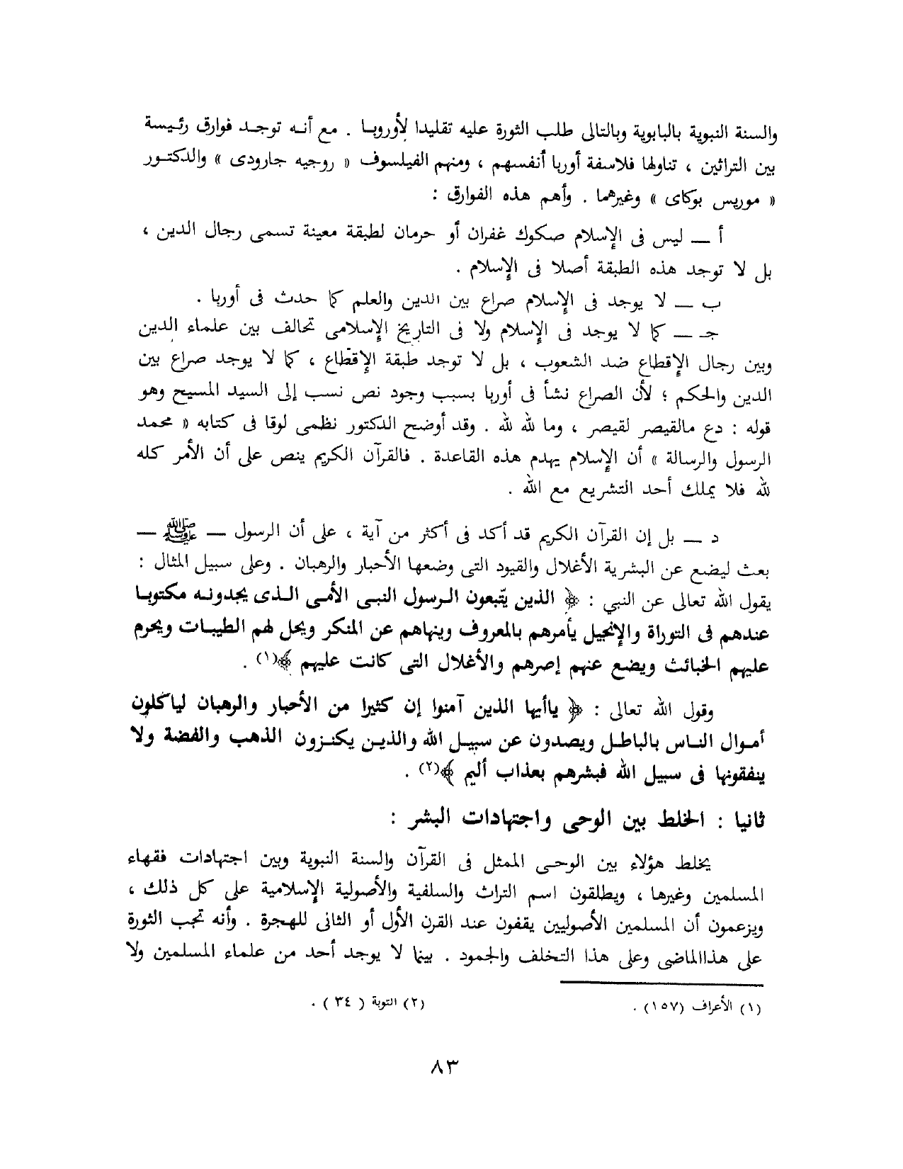 د - بل إن القرآن الكريم قد أكد في أكثر من آية، على أن الرسول - صَلَّى اللهُ عَلَيْهِ وَسَلَّمَ - بعث ليضع عن البشرية الأغلال والقيود التي وضعها الأحبار والرهبان. وعلى سبيل المثال، يقول الله تعالى عن النبي: {الَّذِينَ يَتَّبِعُونَ الرَّسُولَ النَّبِيَّ الأُمِّيَّ الَّذِي يَجِدُونَهُ مَكْتُوبًا عِنْدَهُمْ فِي التَّوْرَاةِ وَالإِنْجِيلِ يَأْمُرُهُمْ بِالْمَعْرُوفِ وَيَنْهَاهُمْ عَنِ الْمُنْكَرِ وَيُحِلُّ لَهُمُ الطَّيِّبَاتِ وَيُحَرِّمُ عَلَيْهِمُ الْخَبَائِثَ وَيَضَعُ عَنْهُمْ إِصْرَهُمْ وَالأَغْلاَلَ الَّتِي كَانَتْ عَلَيْهِمْ} (¬1).