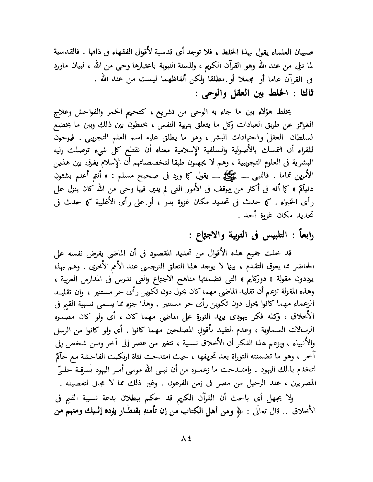 صبيان العلماء يقول بهذا الخلط، فلا يوجد أي قدسية لأقوال الفقهاء في ذاتها. فالقدسية لما نزل من عند الله وهو القرآن الكريم، وللسنة النبوية باعتبارها وحي من الله، لبيان ما ورد في القرآن عَامًّا أو مجملاً أو مطلقًا ولكن ألفاظهما ليست من عند الله.