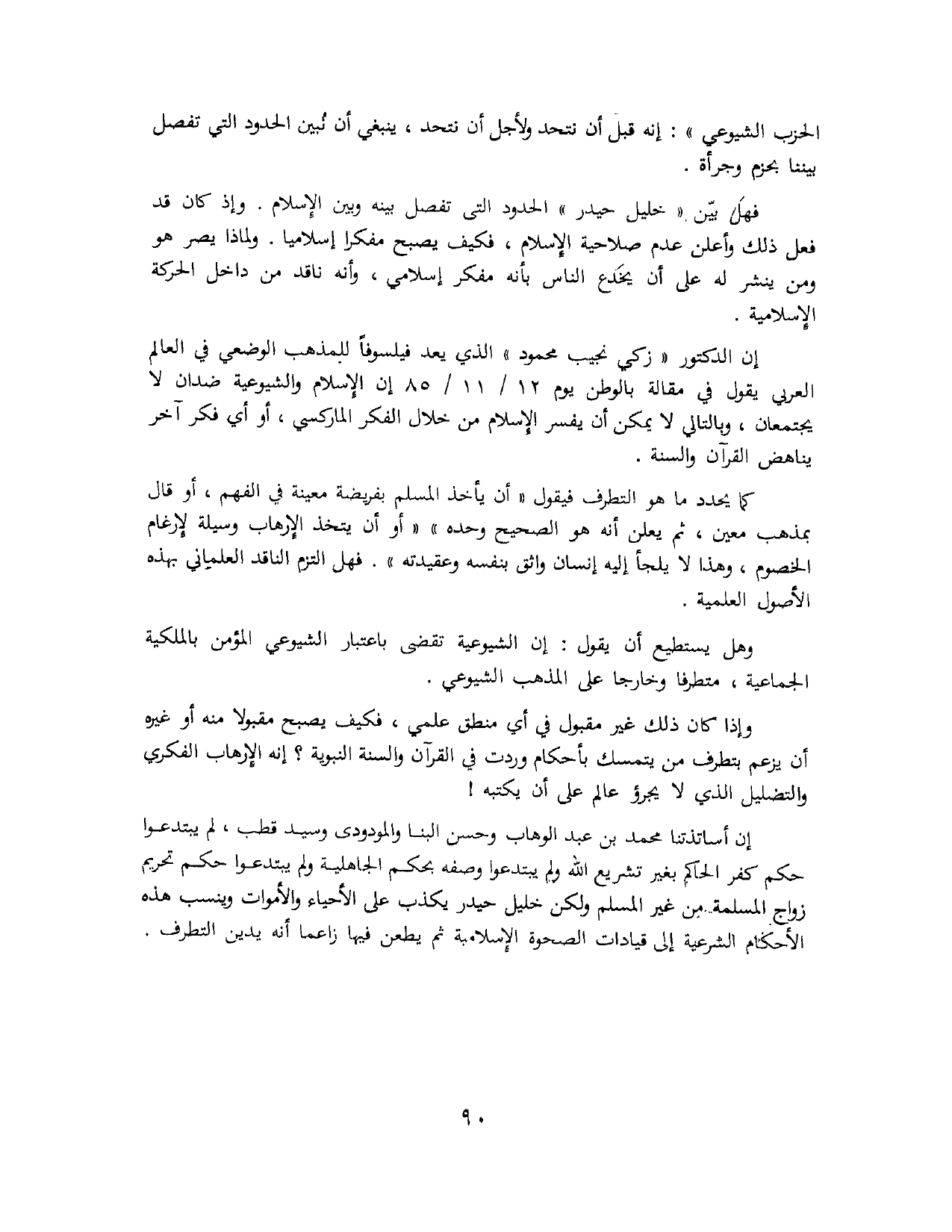 إن أساتذتنا محمد بن عبد الوهاب وحسن البنا والمودودي وسيد قطب، لم يبتدعوا حكم كفر الحاكم بغير تشريع الله ولم يبتدعوا وصفه بحكم الجاهلية ولم يبتدعوا حكم تحريم زواج المسلمة من غير المسلم ولكن خليل حيدر يكذب على الأحياء والأموات وينسب هذه الأحكام الشرعية إلى قيادات الصحوة الإسلامية ثم يطعن فيها زاعمًا أنه يدين التطرف.
