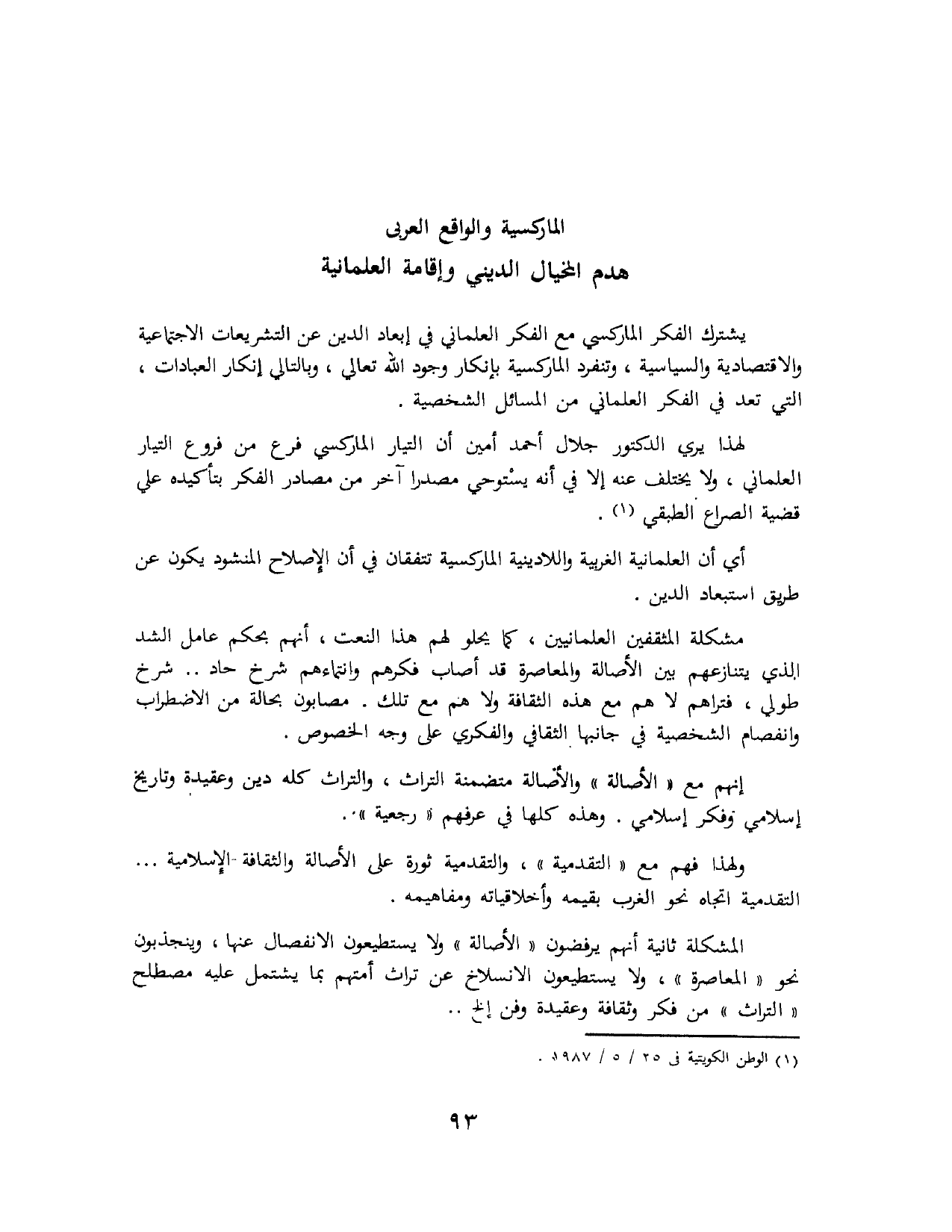 لهذا يرى الدكتور جلال أحمد أمين أن التيار الماركسي فرع من فروع التيار العلماني، ولا يختلف عنه إلا في أنه يستوحي مصدرًا آخر من مصادر الفكر بتأكيده على قضية الصراع الطبقي (¬1).