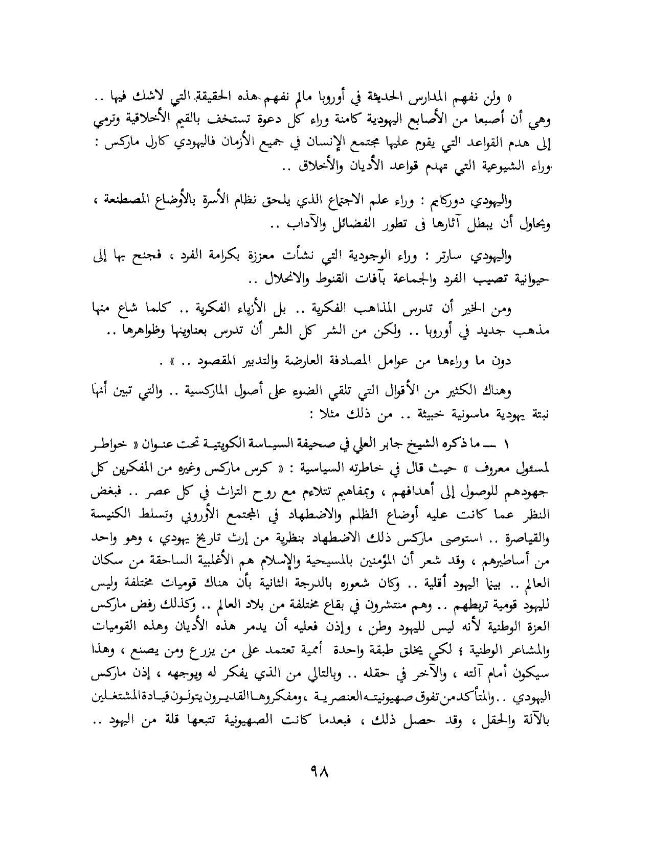 1 - ما ذكره الشيخ جابر العلي في صحيفة " السياسة " الكويتية تحت عنوان " خواطر لمسؤول معروف "، حيث قال في خاطرته السياسية: «كرس ماركس وغيره من المفكرين كل جهودهم للوصول إلى أهدافهم، وبمفاهيم تتلاءم مع روح التراث في كل عصر .. فبغض النظر عما كانت عليه أوضاع الظلم والاضطهاد في المجتمع الأوروبي وتسلط الكنيسة والقياصرة .. استوصى ماركس ذلك الاضطهاد بنظرية من إرث تاريخ يهودي، وهو واحد من أساطيرهم، وقد شعر أن المؤمنين بالمسيحية والإسلام هو الأغلبية الساحقة من سكان العالم .. بينما اليهود أقلية .. وكان شعوره بالدرجة الثانية بأن هناك قوميات مختلفة وليس لليهود قومية تربطهم .. وهم منتشرون في بقاع مختلفة من بلاد العالم .. وكذلك رفض ماركس العزة الوطنية لأنه ليس لليهود وطن، وإذن فعليه أن يدمر هذه الأديان وهذه القوميات والمشاعر الوطنية، لكي يخلق طبقة واحدة أممية تعتمد على من يزرع ومن يصنع، وهذا سيكون أمام آلته، والآخر في حقله .. وبالتالي من الذي يفكر له ويوجهه، إذن ماركس اليهودي .. والمتأكد من تفوق صهيونيته العنصرية، ومفكروها القديرون يتولون قيادة المشتغلين بالآلة والحقل، وقد حصل ذلك، فبعدما كانت الصهيونية تتبعها قلة من اليهود ..