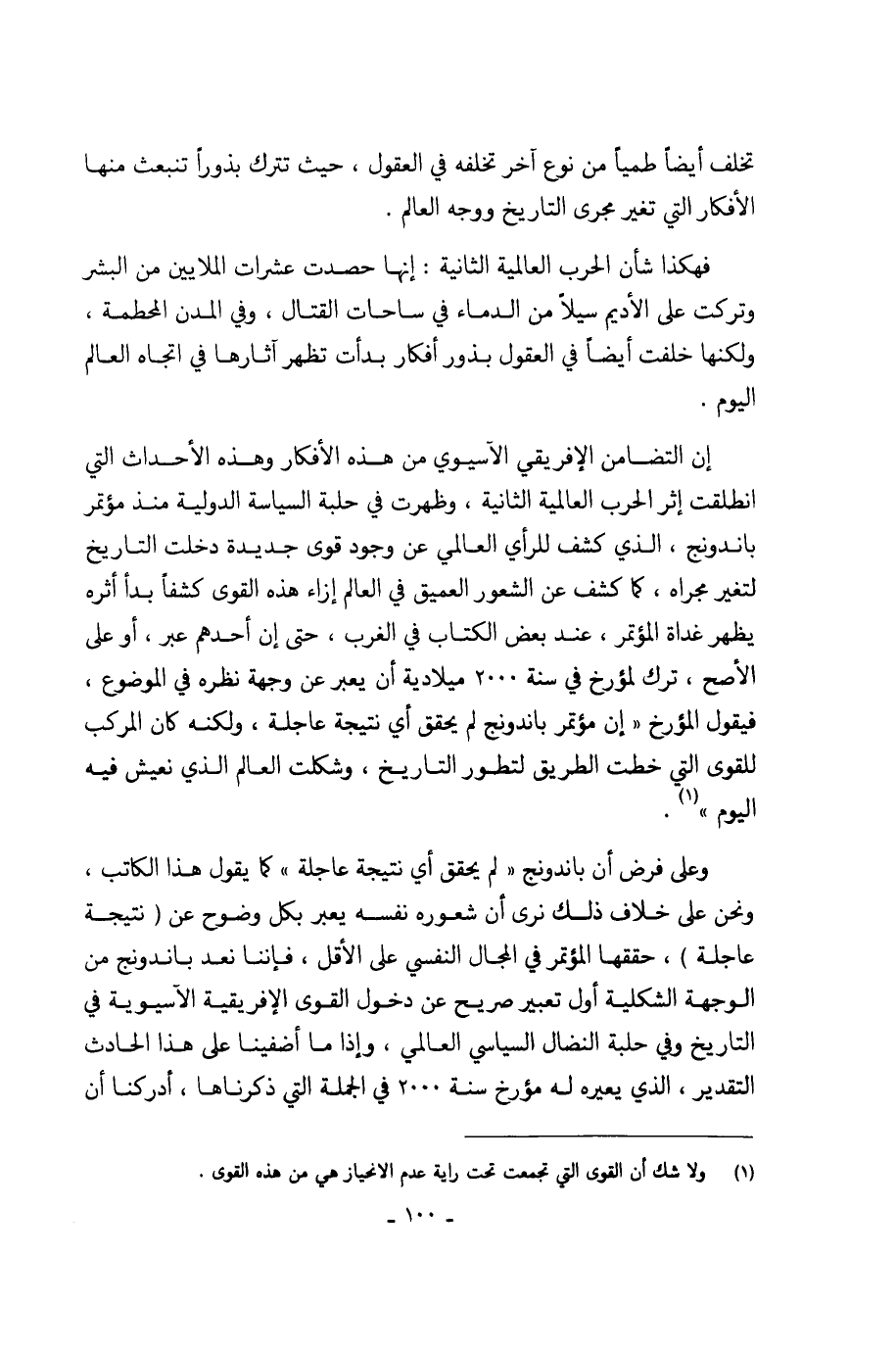 وعلى فرض أن باندونج ((لم يحقق أي نتيجة عاجلة)) كما يقول هذا الكاتب، ونحن على خلاف ذلك نرى أن شعوره نفسه يعبر بكل وضوح عن (نتيجة عاجلة)، حققها المؤتمر في المجال النفسي على الأقل، فإننا نعد باندونج من الوجهة الشكلية أول تعبير صريح عن دخول القوى الإفريقية الآسيوية في التاريخ وفي حلبة النضال السياسي العالمي، وإذا ما أضفينا على هذا الحادث التقدير، الذي يعيره له مؤرخ سنة 2000 في الجملة التي ذكرناها، أدركنا أن