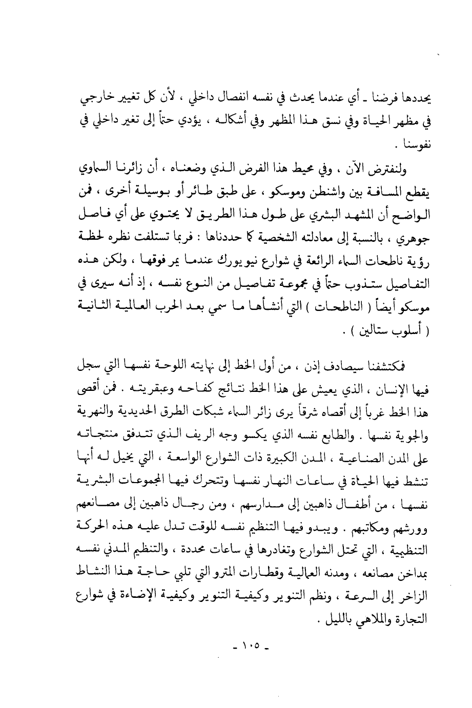 فيها الإنسان، الذي يعيش على هذا الخط نتائج كفاحه وعبقريته. فمن أقصى هذا الخط غرباً إلى أقصاه شرقاً يرى زائر السماء شبكات الطرق الحديدية والنهرية والجوية نفسها. والطابع نفسه الذي يكسو وجه الريف الذي تتدفق منتجاته على المدن الصناعية، المدن الكبيرة ذات الشوارع الواسعة، التي يخيل له أنها تنشط فيها الحياة في ساعات النهار نفسها وتتحرك فيها المجموعات البشرية نفسها، من أطفال ذاهبين إلى مدارسهم، ومن رجال ذاهبين إلى مصانعهم وورشهم ومكاتبهم. ويبدو فيها التنظيم نفسه للوقت تدل عليه هذه الحركة التنظيمية، التي تحتل الشوارع وتغادرها في ساعات محددة، والتنظيم المدني نفسه بمداخن مصانعه، ومدنه العمالية وقطارات المترو التي تلي حاجة هذا النشاط الزاخر إلى السرعة، ونظم التنوير وكيفية التنوير وكيفية الإضاءة في شوارع التجارة والملاهي بالليل.