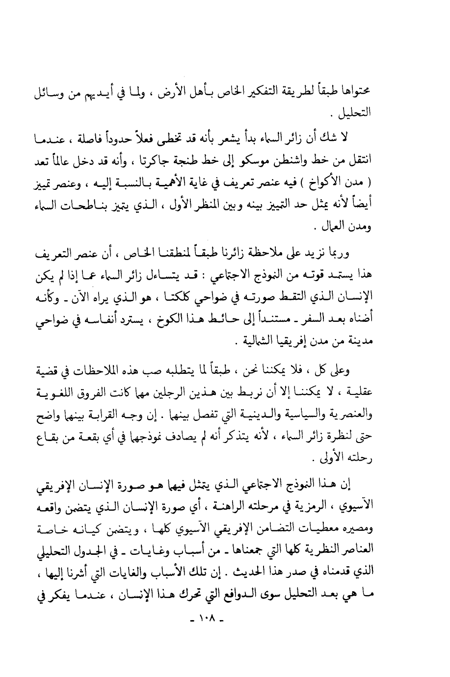 لا شك أن زائر السماء بدأ يشعر بأنه قد تخطى فعلاً حدوداً فاصلة، عندما انتقل من خط واشنطن موسكو إلى خط طنجة جاكارتا، وأنه قد دخل عالماً تعد (مدن الأكواخ) فيه عنصر تعريف في غاية الأهمية بالنسبة إليه، وعنصر تمييز أيضاً لأنه يمثل حد التمييز بينه وبين النظر الأول، الذي يتميز بناطحات السماء ومدن العمال.