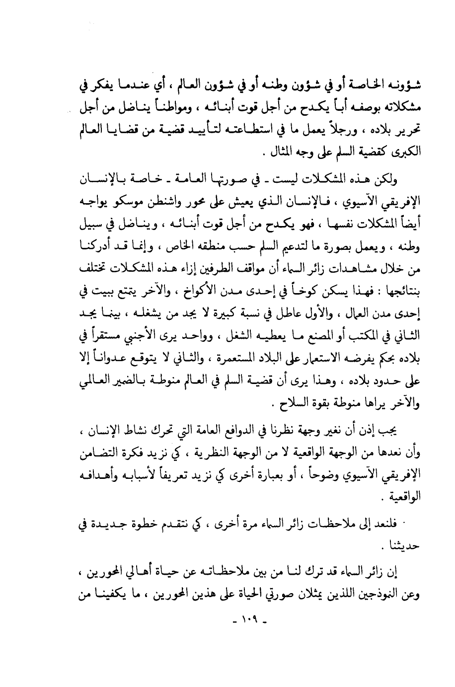 ولكن هذه المشكلات ليست- في صورتها العأمة- خاصة بالإنسان الإفريقي الآسيوي، فالإنسان الذي يعيش على محور واشنطن موسكو يواجه أيضاً المشكلات نفسها، فهو يكدح من أجل قوت أبنائه، ويناضل في سبيل وطنه، ويعمل بصورة ما لتدعيم السلم حسب منطقه الخاص، وإنما قد أدركنا من خلال مشاهدات زائر السماء أن مواقف الطرفين إزاء هذه المشكلات تختلف بنتائجها: فهذا يسكن كوخاً في إحدى مدن الأكواخ، والآخر يتمتع ببيت في إحدى مدن العمال، والأول عاطل في نسبة كبيرة لا يجد من يشغله، بينما يجد الثاني في المكتب أو المصنع ما يعطيه الشغل، وواحد يرى الأجنبي مستقراً في بلاده بحكم يفرضه الإستعمار على البلاد المستعمرة، والثاني لا يتوقع عدواناً إلا على حدود بلاده، وهذا يرى أن قضية السلم في العالم منوطة بالضمير العالمي والآخر يراها منوطة بقوة السلاح.