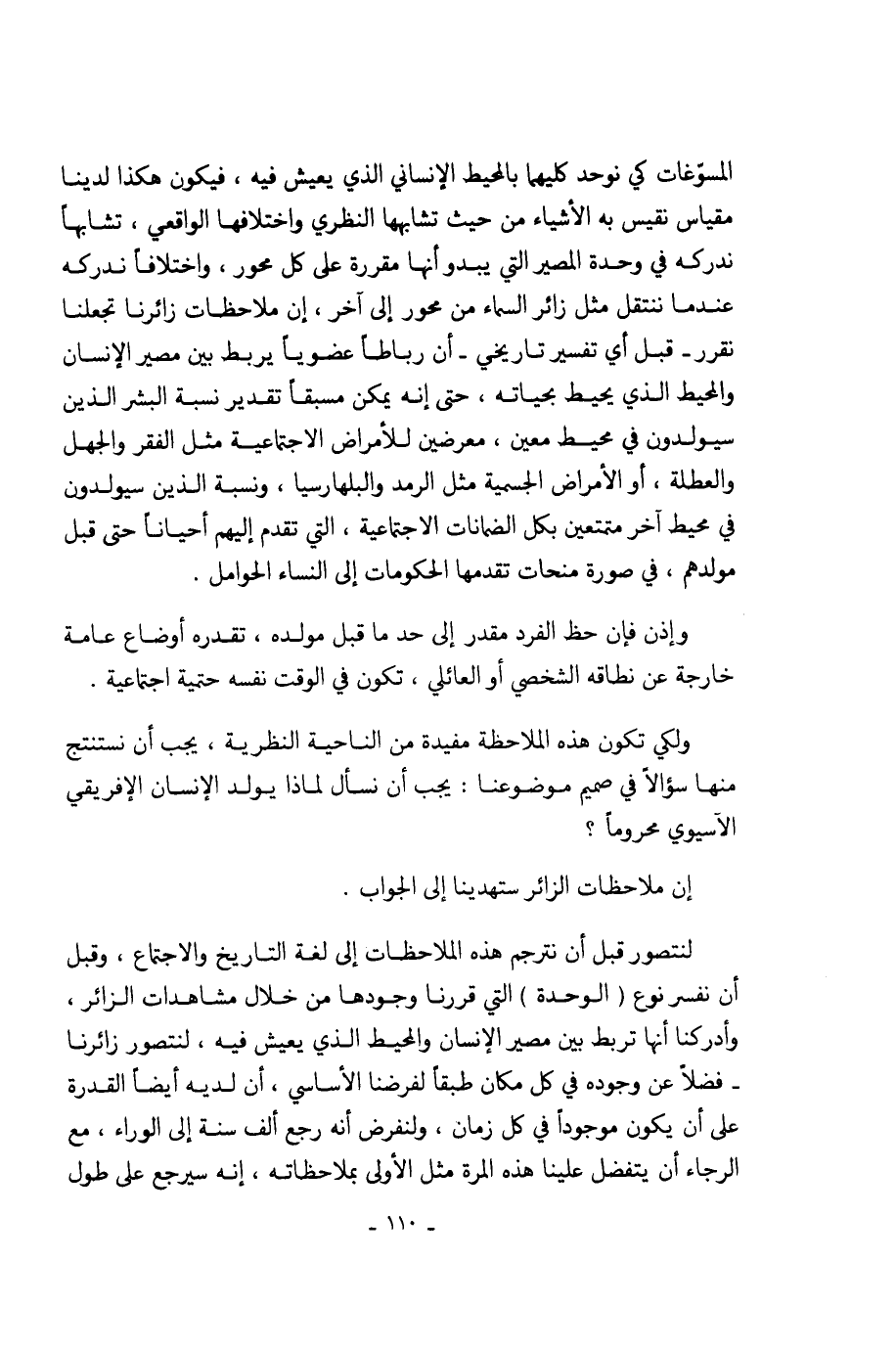 المسوّغات كي نوحد كليهما بالمحيط الإنساني الذي يعيش فيه، فيكون هكذا لدينا مقياس نقيس به الأشياء من حيث تشابهها النظري واختلافها الواقعي، تشابها ندركه في وحدة المصير التي يبدو أنها مقررة على كل محور، واختلافا ندركه عندما ننتقل مثل زائر السماء من محور إلى آخر، إن ملاحظات زائرنا تجعلنا نقرر- قبل أي تفسير تاريخي- أن رباطا عضويا يربط بين مصير الإنسان والمحيط الذي يحيط بحياته، حتى إنه يمكن مسبقا تقدير نسبة البشر الذين سيولدون في محيط معين، معرضين للأمراض الإجتماعية مثل الفقر والجهل والعطلة، أو الأمراض الجسمية مثل الرمد والبلهارسيا، ونسبة الذين سيولدون في محيط آخر متمتعين بكل الضمانات الإجتماعية، التي تقدم إليهم أحيانا حتى قبل مولدهم، في صورة منحات تقدمها الحكومات إلى النساء الحوامل.