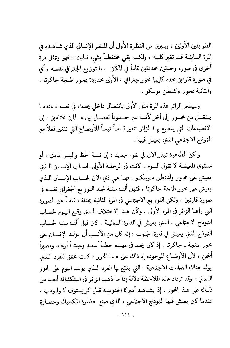 الطريقين الأولين، وسيرى من النظرة الأولى أن المنظر الإنساني الذي شاهده في المرة السابقة قد تغير كلية، ولكنه بقي محتفظا بشيء ثابت: فهو يتمثل مرة أخرى في صورة وحدتين محددتين تماما في المكان، بالتوزيع الجغرافي نفسه، أي في صورة قارتين يحدد كليهما محور جغرافي، الأولى محدودة بمحور طنجة جاكرتا، والثانية بمحور واشنطن موسكو.