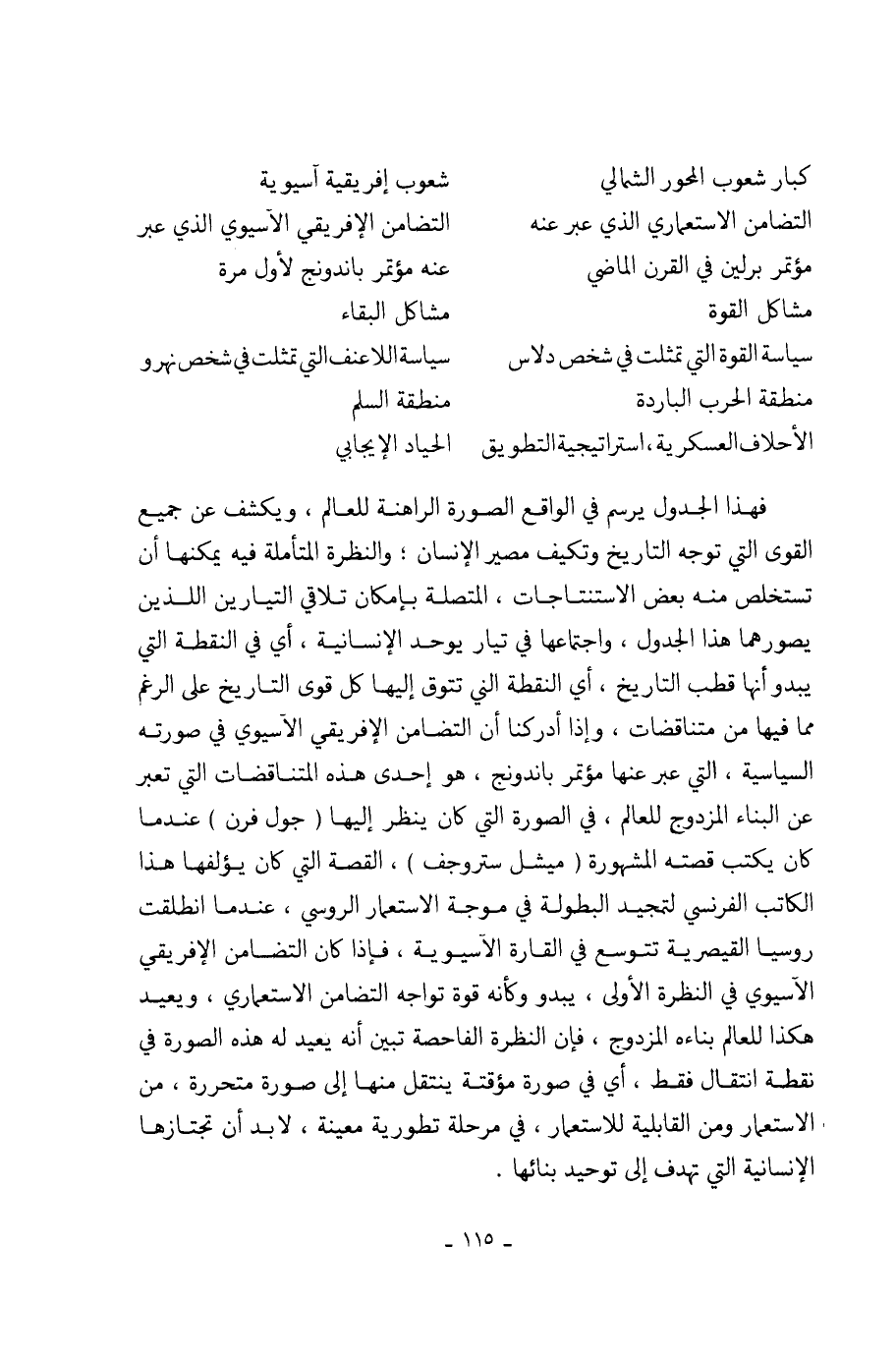 فهذا الجدول يرسم في الواقع الصورة الراهنة للعالم، ويكشف عن جميع القوى التي توجه التاريخ وتكيف مصير الإنسان؛ والنظرة المتأملة فيه يمكنها أن تستخلص منه بعض الاستنتاجات، المتصلة بإمكان تلاقي التيارين اللذين يصورهما هذا الجدول، واجتماعها في تيار يوحد الإنسانية، أي في النقطة التي يبدو أنها قطب التاريخ، أي النقطة التي تتوق إليها كل قوى التاريخ على الرغم مما فيها من متناقضات، وإذا أدركنا أن التضامن الإفريقي الآسيوي في صورته السياسية، التي عبر عنها مؤتمر باندونج، هو إحدى هذه التناقضات التي تعبر عن البناء المزدوج للعالم، في الصورة التي كان ينظر إليها (جول فرن) عندما كان يكتب قصته المشهورة (ميشل ستروجف)، القصة التي كان يؤلفها هذا الكاتب الفرنسي لتمجيد البطولة في موجة الإستعمار الروسي، عندما انطلقت روسيا القيصرية تتوسع في القارة الآسيوية، فإذا كان التضامن الإفريقي الآسيوي في النظرة الأولى، يبدو وكأنه قوة تواجه التضامن الإستعماري، ويعيد هكذا للعالم بناءه المزدوج، فإن النظرة الفاحصة تبين أنه يعيد له هذه الصورة في نقطة انتقال فقط، أي في صورة مؤقتة ينتقل منها إلى صورة متحررة، من الإستعمار ومن القابلية للاستعمار، في مرحلة تطورية معينة، لابد أن تجتازها الإنسانية التي تهدف إلى توحيد بنائها.
