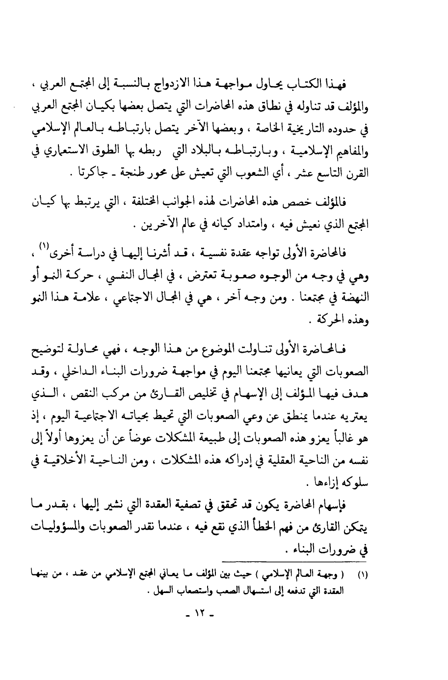 فهذا الكتاب يحاول مواجهة هذا الازدواج بالنسبة إلى المجتمع العربي، والمؤلف قد تناوله في نطاق هذه المحاضرات التي يتصل بعضها بكيان المجتمع العربي في حدوده التاريخية الخاصة، وبعضها الآخر يتصل بارتباطه بالعالم الإسلامي والمفاهيم الإسلامية، وبارتباطه بالبلاد التي ربطه بها الطوق الإستعماري في القرن التاسع عشر، أي الشعوب التي تعيش على محور طنجة- جاكرتا.