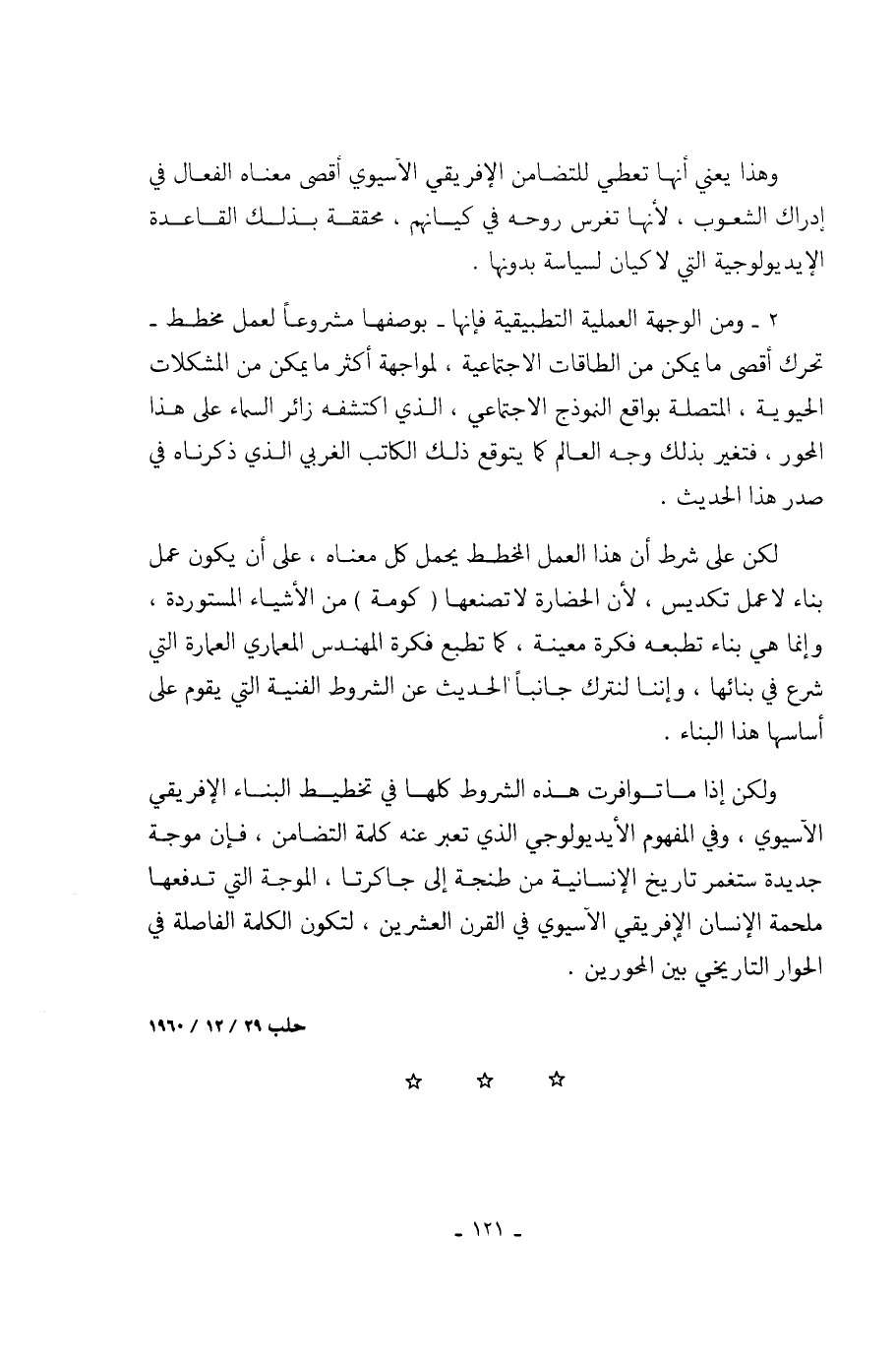 ولكن إذا ما توافرت هذه الشروط كلها في تخطيط البناء الإفريقي الآسيوي، وفي المفهوم الأيديولوجي الذي تعبر عنه كلمة التضامن، فإن موجة جديدة ستغمر تاريخ الإنسانية من طنجة إلى جاكرتا، الموجة التي تدفعها ملحمة الإنسان الإفريقي الآسيوي في القرن العشرين، لتكون الكلمة الفاصلة في الحوار التاريخي بين المحورين.