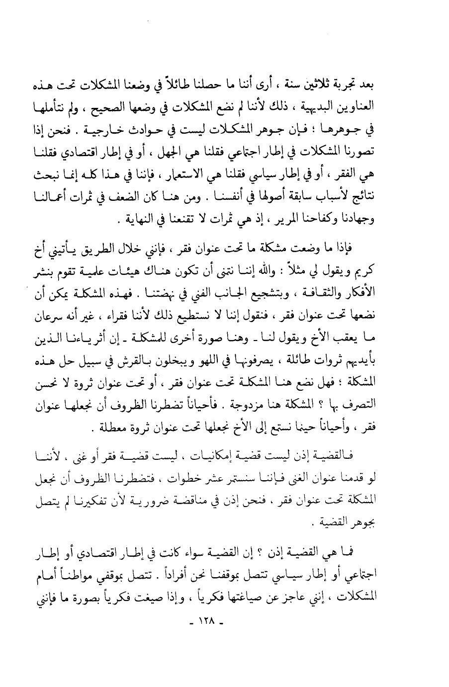 بعد تجربة ثلانين سنة، أرى أننا ما حصلنا طائلاً في وضعنا المشكلات تحت هذه العناوين البديهية، ذلك لأننا لم نضع المشكلات في وضعها الصحيح، ولم نتأملها في جوهرها؛ فإن جوهر المشكلات ليست في حوادث خارجية. فنحن إذا تصورنا المشكلات في إطار اجتماعي فقلنا هي الجهل، أو في إطار إقتصادي فقلنا هي الفقر، أو في إطار سياسي فقلنا هي الإستعمار، فإننا في هذا كله إنما نبحث نتائج لأسباب سابقة أصولها في أنفسنا. ومن هنا كان الضعف في ثمرات أعمالنا وجهادنا وكفاحنا المرير، إذ هي ثمرات لا تقنعنا في النهاية.