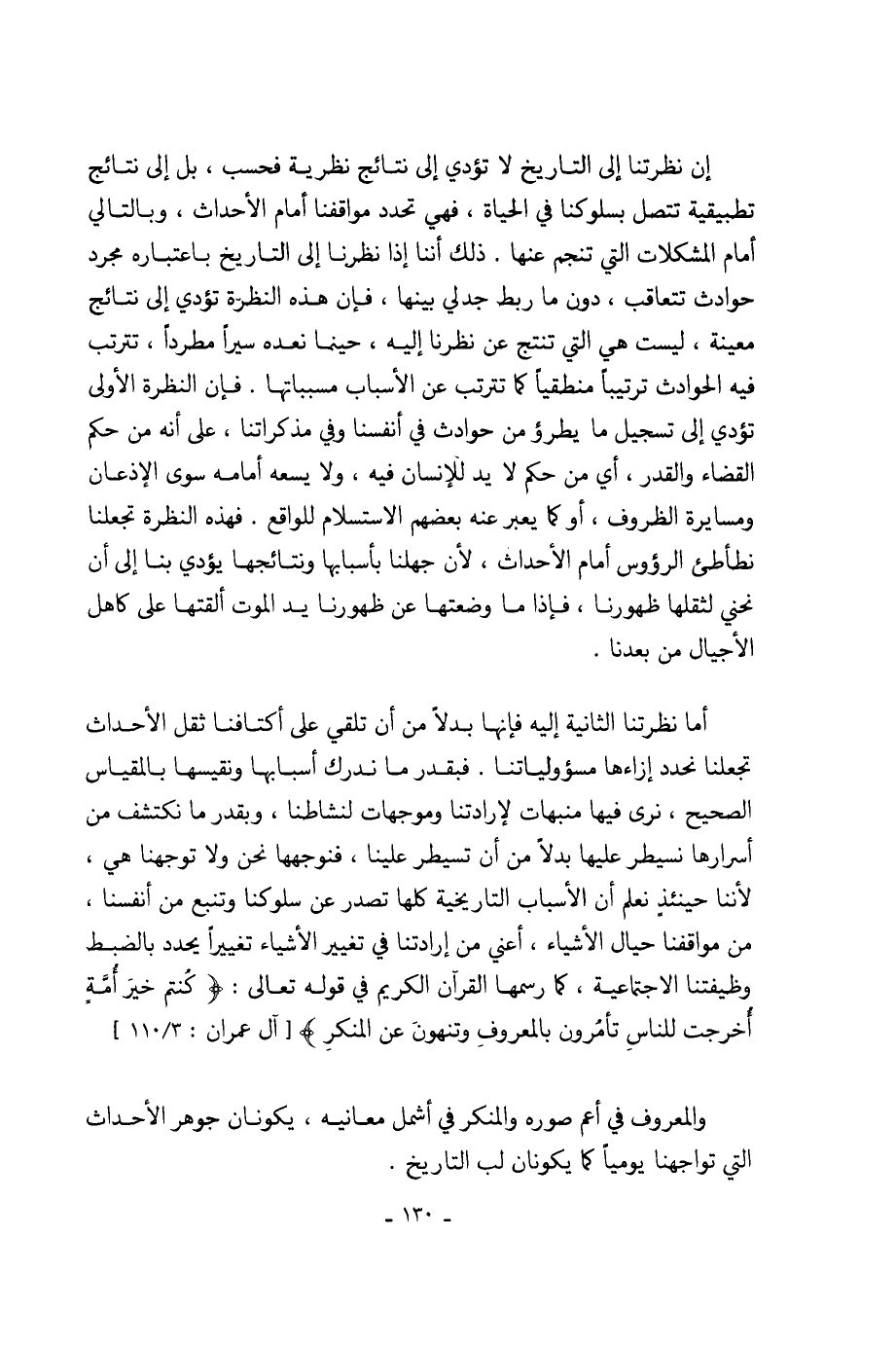 أما نظرتنا الثانية إليه فإنها بدلاً من أن تلقي على أكتافنا ثقل الأحداث تجعلنا نحدد إزاءها مسؤولياتنا. فبقدر ما ندرك أسبابها ونقيسها بالقياس الصحيح، نرى فيها منبهات لإرادتنا وموجهات لنشاطنا، وبقدر ما نكتشف من أسرارها نسيطر عليها بدلاً من أن تسيطر علينا، فنوجهها نحن ولا توجهنا هي، لأننا حينئذٍ نعلم أن الأسباب التاريخية كلها تصدر عن سلوكنا وتنبع من أنفسنا، من مواقفنا حيال الأشياء، أعني من إرادتنا في تغيير الأشياء تغييراً يحدد بالضبط وظيفتنا الاجتماعية، كما رسمها القرآن الكريم في قوله تعالى: {كُنْتُمْ خَيْرَ أُمَّةٍ أُخْرِجَتْ لِلنَّاسِ تَأْمُرُونَ بِالْمَعْرُوفِ وَتَنْهَوْنَ عَنِ الْمُنْكَرِ} [آل عمران: 110/ 3].