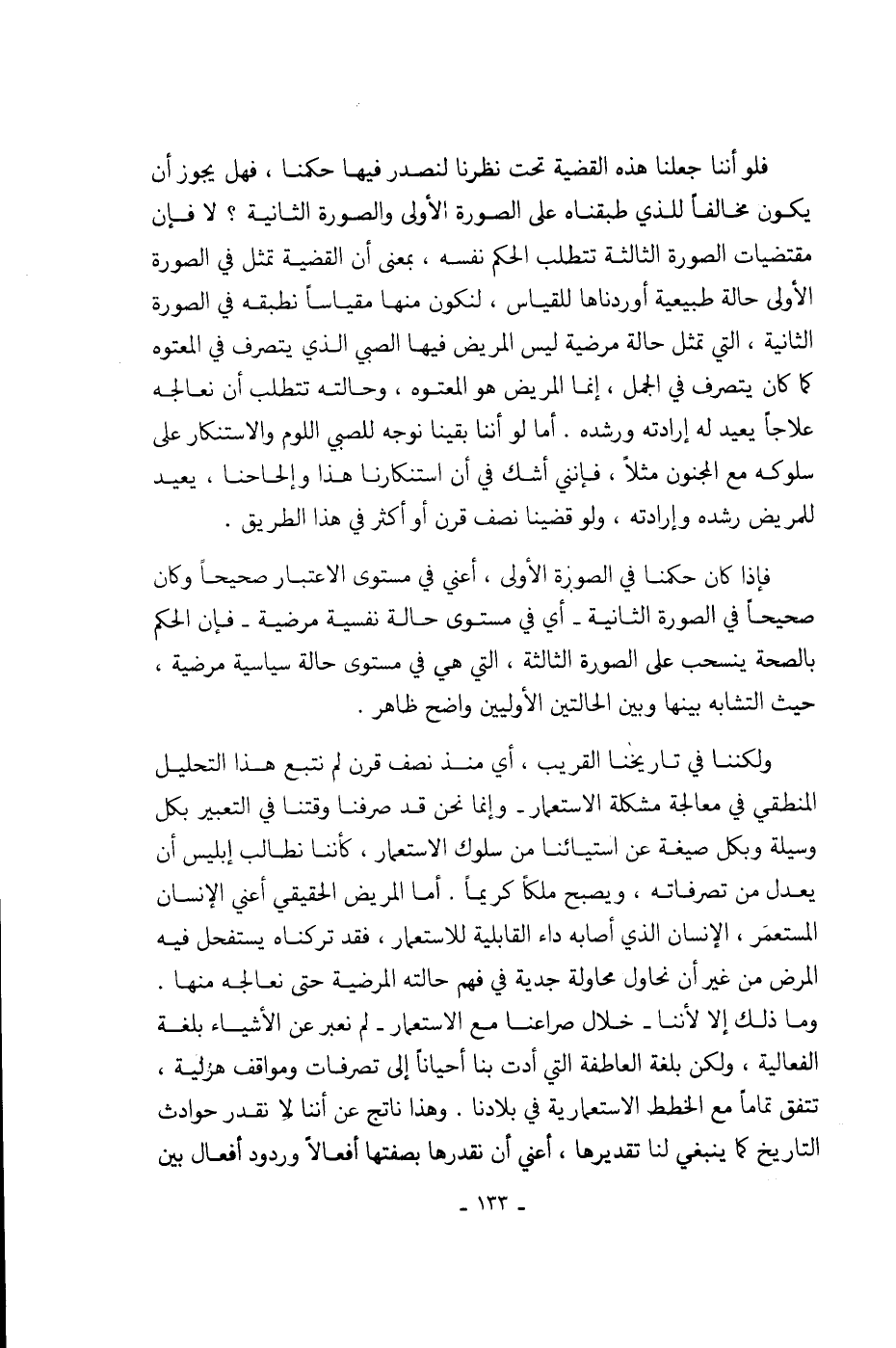 ولكننا في تاريخنا القريب، أي منذ نصف قرن لم نتبع هذا التحليل المنطقي في معالجة مشكلة الإستعمار- وإنما نحن قد صرفنا وقتنا في التعبير بكل وسيلة وبكل صيغة عن استيائنا من سلوك الإستعمار، كأننا نطالب إبليس أن يعدل من تصرفاته، ويصبح ملكا كريماً. أما المريض الحقيقي أعني الإنسان المستعمَر، الإنسان الذي أصابه داء القابلية للاستعمار، فقد تركناه يستفحل فيه المرض من غير أن نحاول محاولة جدية في فهم حالته المرضية حتى نعالجه منها. وما ذلك إلا لأننا- خلال صراعنا مع الإستعمار- لم نعبر عن الأشياء بلغة الفعالية، ولكن بلغة العاطفة التي أدت بنا أحياناً إلى تصرفات ومواقف هزلية، تتفق تماماً مع الخطط الإستعمارية في بلادنا. وهذا ناتج عن أننا لا نقدر حوادث التاريخ كما ينبغي لنا تقديرها، أعني أن نقدرها بصفتها أفعالاً وردود أفعال بين