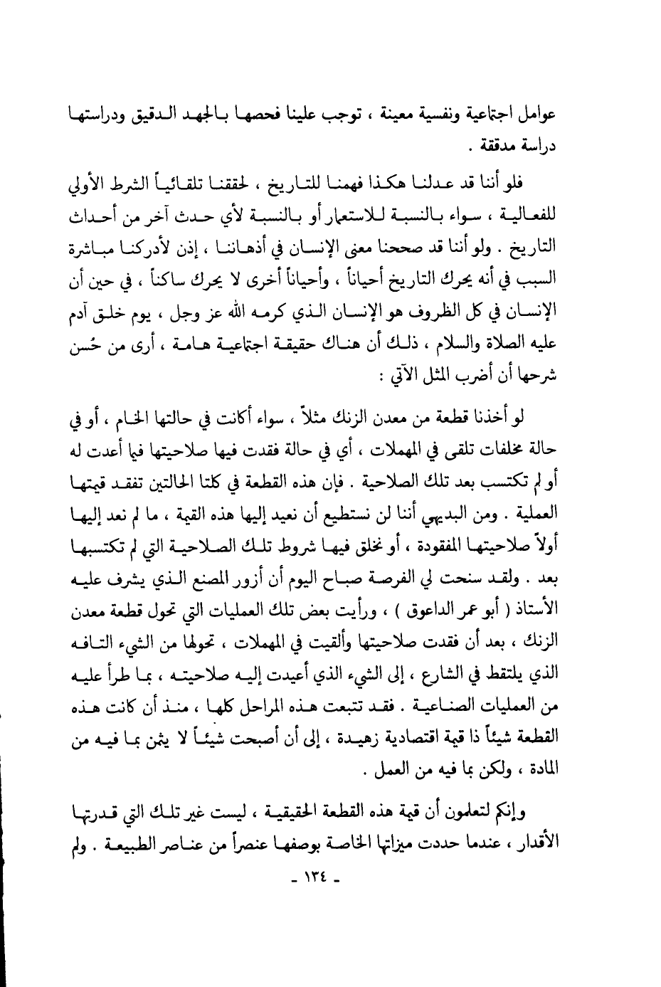 لو أخذنا قطعة من معدن الزنك مثلاً، سواء أكانت في حالتها الخام، أو في حالة مخلفات تلقى في المهملات، أي في حالة فقدت فيها صلاحيتها فما أعدت له أو تكتسب بعد تلك الصلاحية. فإن هذه القطعة في كلتا الحالتين تفقد قيمتها العملية. ومن البديهي أننا لن نستطيع أن نعيد إليها هذه القيمة، ما لم نعد إليها أولاً صلاحيتها المفقودة، أو نخلق فيها شروط تلك الصلاحية التي لم تكتسبها بعد. ولقد سنحت لي الفرصة صباح اليوم أن أزور المصنع الذي يشرف عليه الأستاذ (أبو عمر الداعوق)، ورأيت بعض تلك العمليات التي تحول قطعة معدن الزنك، بعد أن فقدت صلاحيتها وألقيت في المهملات، تحولها من الشيء التافه الذي يلتقط في الشارع، إلى الشيء الذي أعيدت إليه صلاحيته، بما طرأ عليه من العمليات الصناعية. فقد تتبعت هذه المراحل كلها، منذ أن كانت هذه القطعة شيئاً ذا قيمة إقتصادية زهيدة، إلى أن أصبحت شيئاً لا يثمن بما فيه من المادة، ولكن بما فيه من العمل.