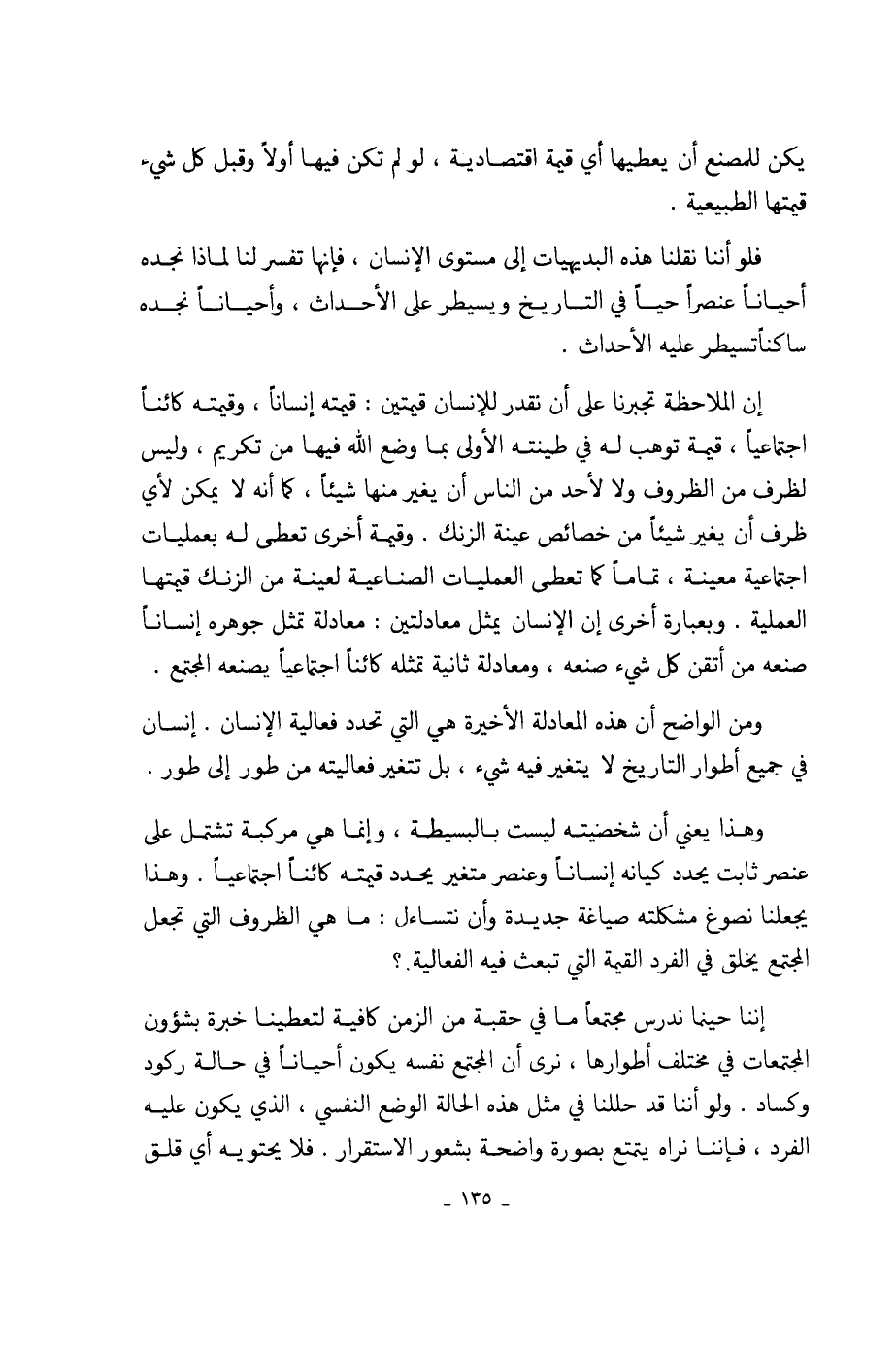إن الملاحظة تجبرنا على أن نقدر للإنسان قيمتين: قيمته إنساناً، وقيمته كائناً اجتماعياً، قيمة توهب له في طينته الأولى بما وضع الله فيها من تكريم، وليس لظرف من الظروف ولا لأحد من الناس أن يغير منها شيئا، كما أنه لا يمكن لأي ظرف أن يغير شيئاً من خصائص عينة الزنك. وقيمة أخرى تعطى له بعمليات اجتماعية معينة، تماماً كما تعطى العمليات الصناعية لعينة من الزنك قيمتها العملية. وبعبارة أخرى إن الإنسان يمثل معادلتين: معادلة تمثل جوهره إنساناً صنعه من أتقن كل شيء صنعه، ومعادلة ثانية تمثله كائنا اجتماعياً يصنعه المجتمع.