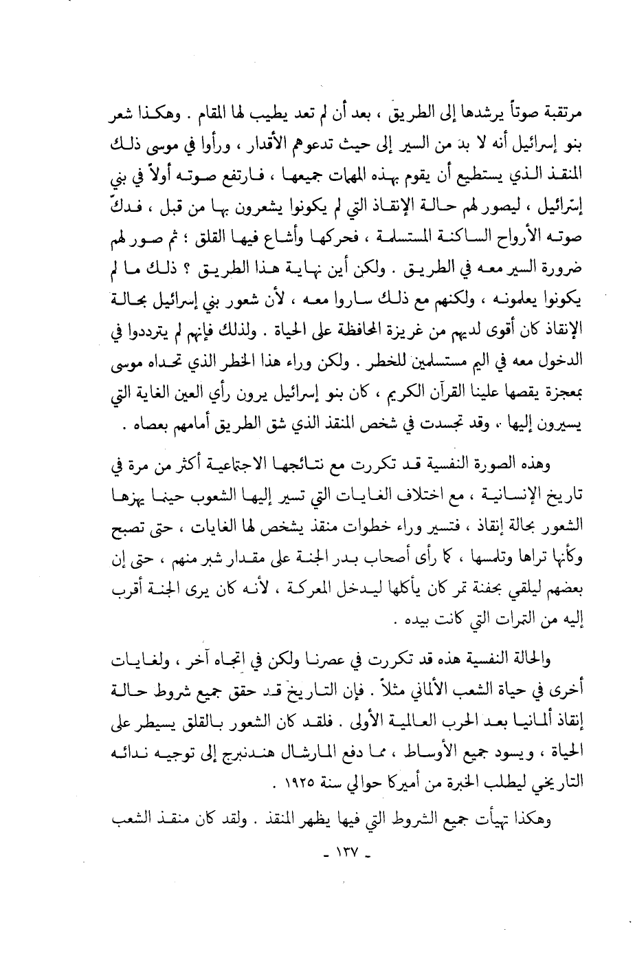 مرتقبة صوتا يرشدها إلى الطريق، بعد أن لم تعد يطيب لها المقام. وهكذا شعر بنو إسرائيل أنه لا بد من السير إلى حيث تدعوهم الأقدار، ورأوا في موسى ذلك النقذ الذي يستطيع أن يقوم بهذه المهمات جميعها، فارتفع صوته أولاً في بني إسرائيل، ليصور لهم حالة الإنقاذ التي لم يكونوا يشعرون بها من قبل، فدكّ صوته الارواح الساكنة المستسلمة، فحركها وأشاع فيها القلق؛ ثم صور لهم ضرورة السير معه في الطريق. ولكن أين نهاية هذا الطريق؟ ذلك مالم يكونوا يعلمونه، ولكنهم مع ذلك ساروا معه، لأن شعور بني إسرائيل بحالة الإنقاذ كان أقوى لديهم من غريزة المحافظة على الحياة. ولذلك فإنهم لم يترددوا في الدخول معه في اليم مستسلمين للخطر. ولكن وراء هذا الخطر الذي تحداه موسى بمعجزة يقصها علينا القرآن الكريم، كان بنو إسرائيل يرون رأي العين الغاية التي يسيرون إليها.، وقد تجسدت في شخص المنقذ الذي شق الطريق أمامهم بعصاه.