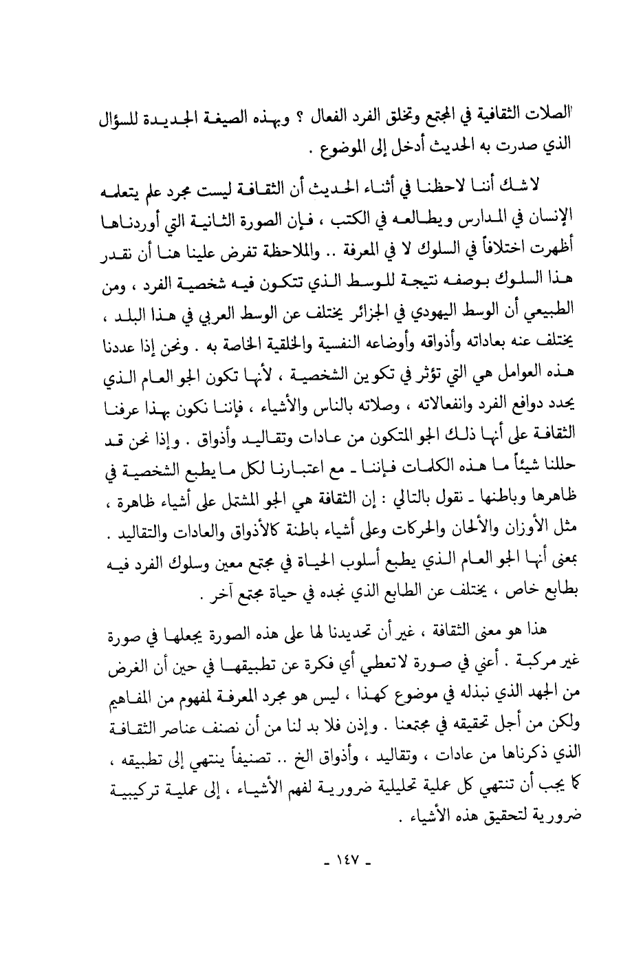الصلات الثقافية في المجتمع وتخلق الفرد الفعال؟ وبهذه الصيغة الجديدة للسؤال الذي صدرت به الحديث أدخل إلى الموضوع.