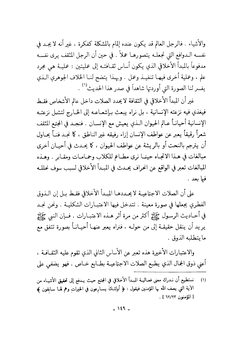 على أن الصلات الاجتماعية لا يحددها المبدأ الأخلاقي فقط بل إن الذوق الفطري يجعلها في صورة معينة. تتدخل فيها الاعتبارات الشكلية. ونحن نجد في أحاديث الرسول - صلى الله عليه وسلم - أكثر من مرة أثر هذه الاعتبارات. فإن النبي - صلى الله عليه وسلم - يريد أن ينقل حقيقة إلى من حوله، فنراه يعبر عنها أحياناً بصورة تتفق مع ما يتطلبه الذوق.