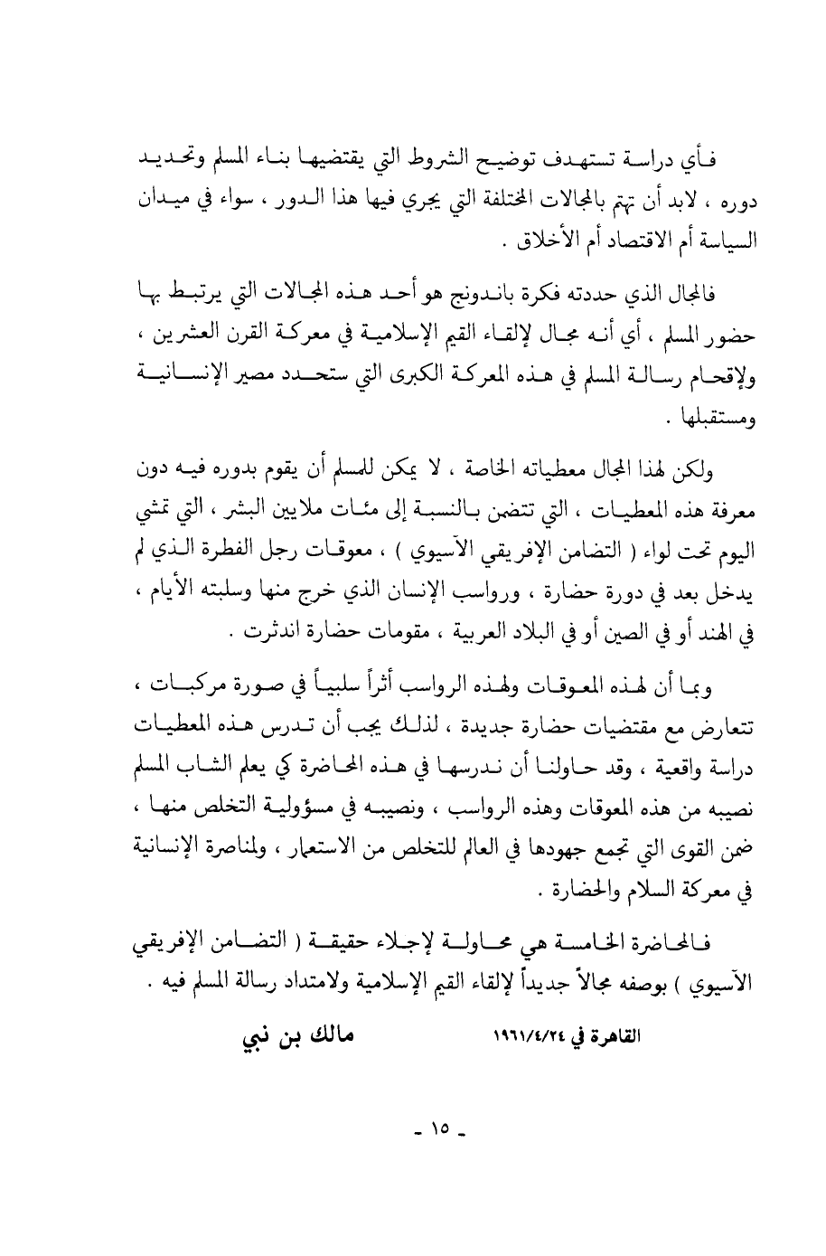 وبما أن لهذه المعوقات ولهذه الرواسب أثراً سلبياً في صورة مركبات، تتعارض مع مقتضيات حضارة جديدة، لذلك يجب أن تدرس هذه المعطيات دراسة واقعية، وقد حاولنا أن ندرسها في هذه المحاضرة كي يعلم الشاب المسلم نصيبه من هذه المعوقات وهذه الرواسب، ونصيبه في مسؤولية التخلص منها، ضمن القوى التي تجمع جهودها في العالم للتخلص من الإستعمار، ولمناصرة الإنسانية في معركة السلام والحضارة.