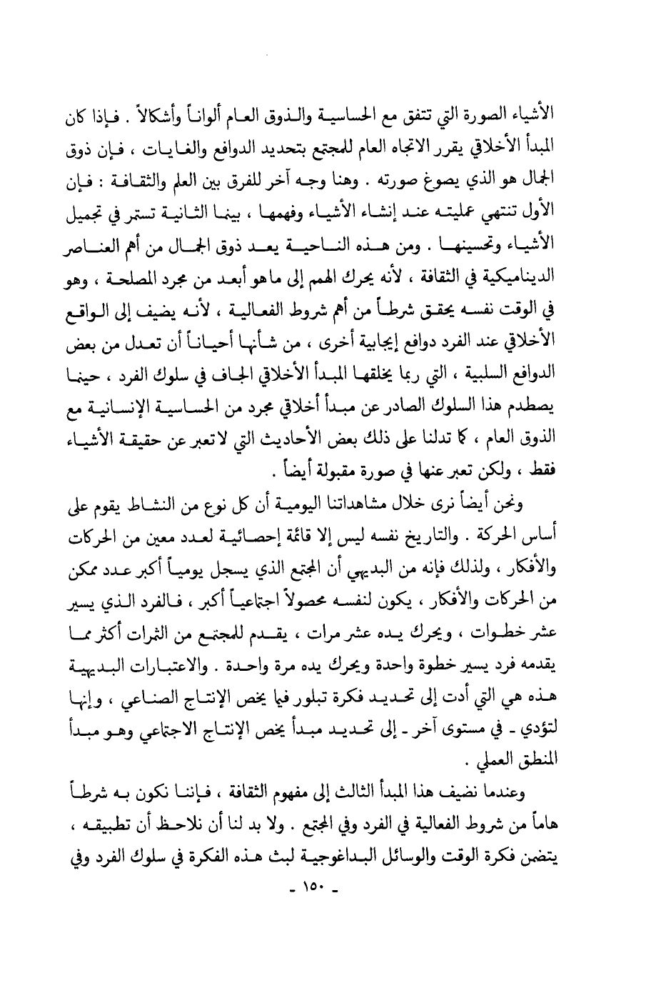 الأشياء الصورة التي تتفق مع الحساسية والذوق العام ألواناً وأشكالا. فإذا كان المبدأ الأخلاقي يقرر الاتجاه العام للمجتمع بتحديد الدوافع والغايات، فإن ذوق الجمال هو الذي يصوغ صورته. وهنا وجه آخر للفرق بين العلم والثقافة: فإن الأول تنتهي عمليته عند إنشاء الأشياء وفهمها، بينما الثانية تستمر في تجميل الأشياء وتحسينها. ومن هذه الناحية يعد ذوق الجمال من أهم العناصر الديناميكية في الثقافة، لأنه يحرك الهمم إلى ما هو أبعد من مجرد المصلحة، وهو في الوقت نفسه يحقق شرطاً من أهم شروط الفعالية، لأنه يضيف إلى الواقع الأخلاقي عند الفرد دوافع إيجابية أخرى، من شأنها أحياناً أن تعدل من بعض الدوافع السلبية، التي ربما يخلقها المبدأ الأخلاقي الجاف في سلوك الفرد، حينما يصطدم هذا السلوك الصادر عن مبدأ أخلاقي مجرد من الحساسية الإنسانية مع الذوق العام، كما تدلنا على ذلك بعض الأحاديث التي لا تعبر عن حقيقة الأشياء فقط، ولكن تعبر عنها في صورة مقبولة أيضا.