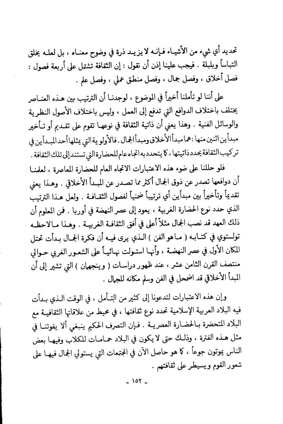 على أننا لو تأملنا أخيراً في الموضوع، لوجدنا أن الترتيب بين هذه العناصر يختلف باختلاف الدوافع التي تدفع إلى العمل، وليس باختلاف الأصول النظرية والوسائل الفنية. وهذا يعني أن ذاتية الثقافة في نوعها تقوم على تقديم أو تأخير مبدأين اثنين منها: هما مبدأ الأخلاق ومبدأ الجمال. فالأولوية التي يمثلها أحد المبدأين في تركيب الثقافة يحدد ذاتيتها، كما يتحدد به اتجاه عام للحضارة التي تستند إلى تلك الثقافة. فلو حللنا على ضوء هذه الإعتبارات الإتجاه العام للحضارة المعاصرة، لعلمنا