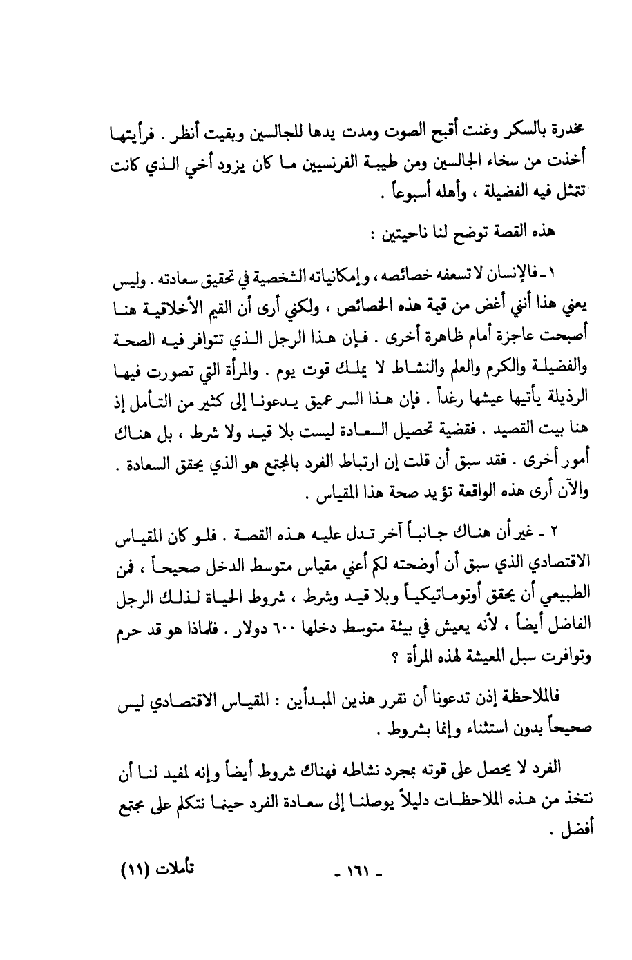 يعني هذا أنني أغض من قيمة هذه الخصائص، ولكني أرى أن القيم الأخلاقية هنا أصبحت عاجزة أمام ظاهرة أخرى. فإن هذا الرجل الذي تتوافر فيه الصحة والفضيلة والكرم والعلم والنشاط لا يملك قوت يوم. والمرأة التي تصورت فيها الرذيلة يأتيها عيشها رغدا. فإن هذا السر عميق يدعونا إلى كثير من التأمل إذ هنا بيت القصيد. فقضية تحصيل السعادة ليست بلا قيد ولا شرط، بل هناك أمور أخرى. فقد سبق أن قلت إن ارتباط الفرد بالمجتمع هو الذي يحقق السعادة. والآن أرى هذه الواقعة تؤيد صحة هذا المقياس.