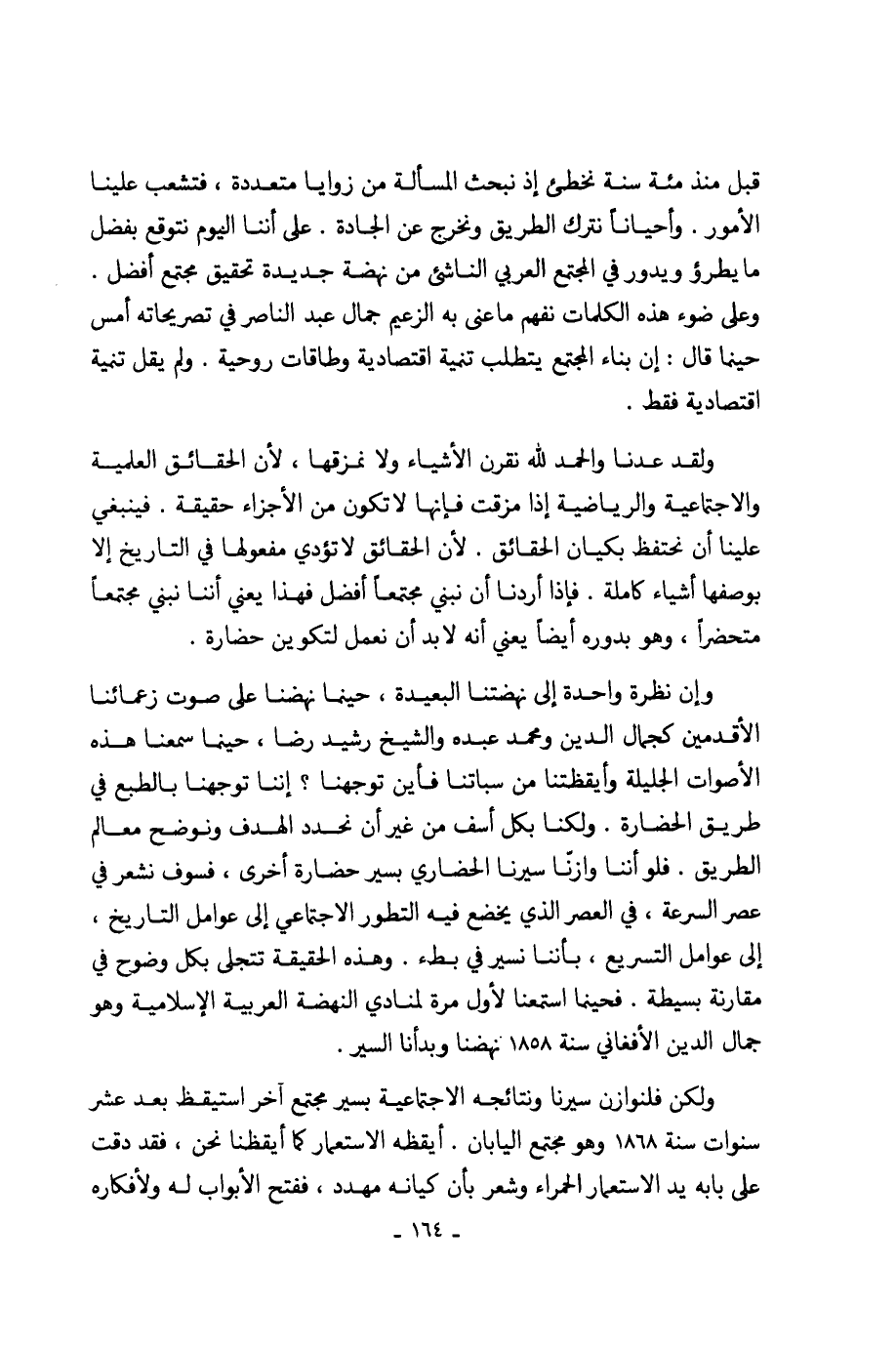 وإن نظرة واحدة إلى نهضتنا البعيدة، حينما نهضنا على صوت زعمائنا الأقدمين كجمال الدين ومحمد عبده والشيخ رشيد رضا، حينما سمعنا هذه الأصوات الجليلة وأيقظتنا من سباتنا فأين توجهنا؟ إننا توجهنا بالطبع في طريق الحضارة. ولكنا بكل أسف من غير أن نحدد الهدف ونوضح معالم الطريق. فلو أننا وازنّا سيرنا الحضاري بسير حضارة أخرى، فسوف نشعر في عصر السرعة، في العصر الذي يخضع فيه التطور الاجتماعي إلى عوامل التاريخ، إلى عوامل التسريع، بأننا نسير في بطء. وهذه الحقيقة تتجلى بكل وضوح في مقارنة بسيطة. فحينما استمعنا لأول مرة لمنادي النهضة العربية الإسلامية وهو جمال الدين الافغاني سنة1858 نهضنا وبدأنا السير.
