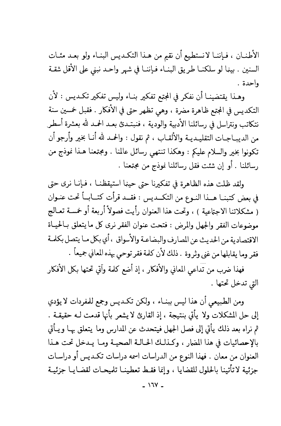 وهذا يقتضينا أن نفكر في المجتمع تفكير بناء وليس تفكير تكديس: لأن التكديس في المجتمع ظاهرة مضرة، وهي تظهر حتى في الأفكار. فقبل خمسين سنة نتكاتب ونتراسل في رسائلنا الأدبية والودية، فنبتدئ بعد الحمد لله بعشرة أسطر من الديباجات التقليدية والألقاب، ثم نقول: والحمد لله أنا بخير وأرجو أن تكونوا بخير والسلام عليكم: وهكذا تنتهي رسائل عالمنا. ومجتمعنا هذا نموذج من رسائلنا. أو إن شئت فقل رسائلنا نموذج من مجتمعنا.