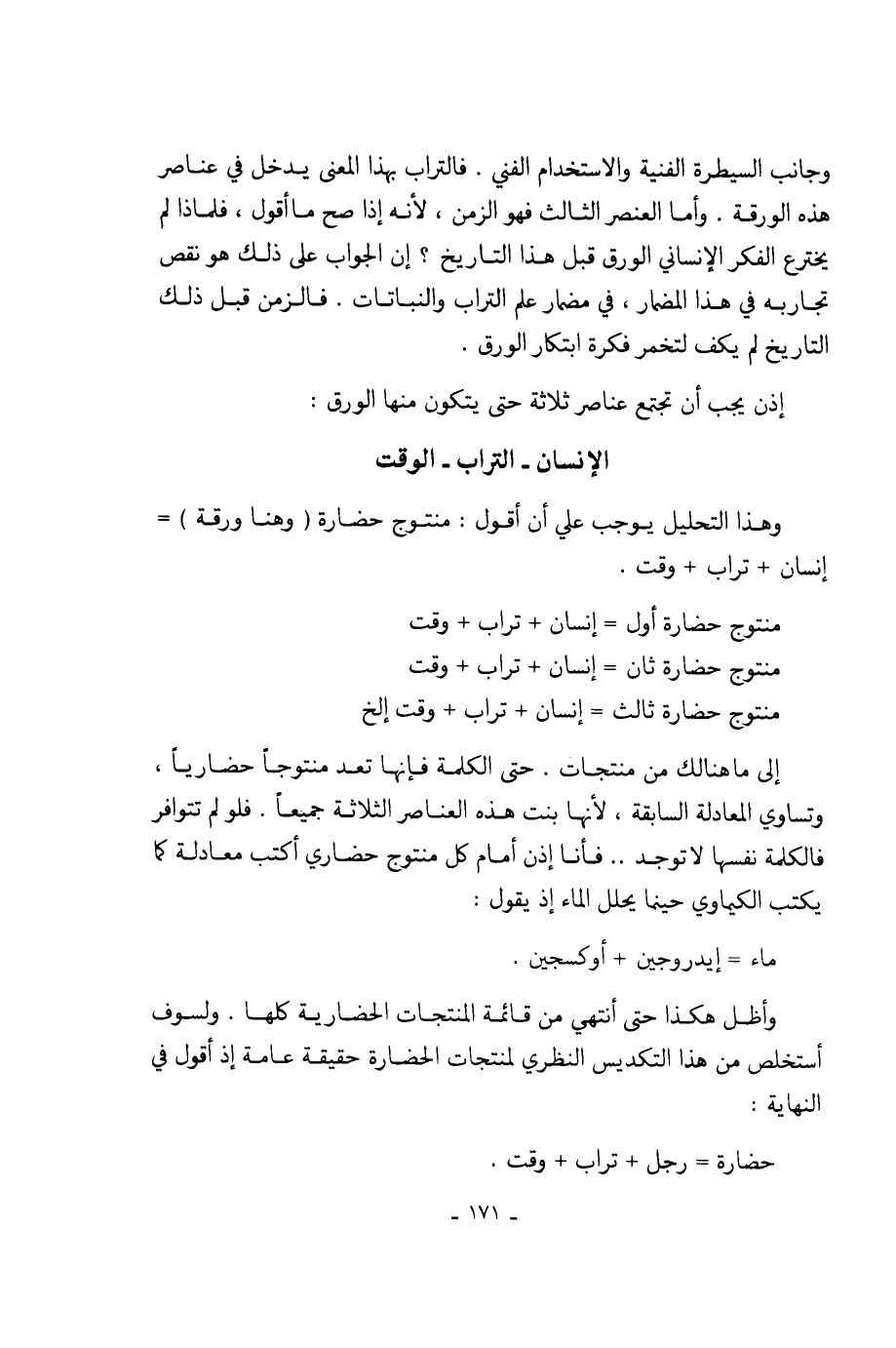 إلى ما هنالك من منتجات. حتى الكلمة فإنها تعد منتوجاً حضارياً، وتساوي المعادلة السابقة، لأنها بنت هذه العناصر الثلاثة جميعاً. فلو لم تتوافر فالكلمة نفسها لا توجد .. فأنا إذن أمام كل منتوج حضاري أكتب معادلة كما يكتب الكيماوي حينما يحلل الماء إذ يقول: