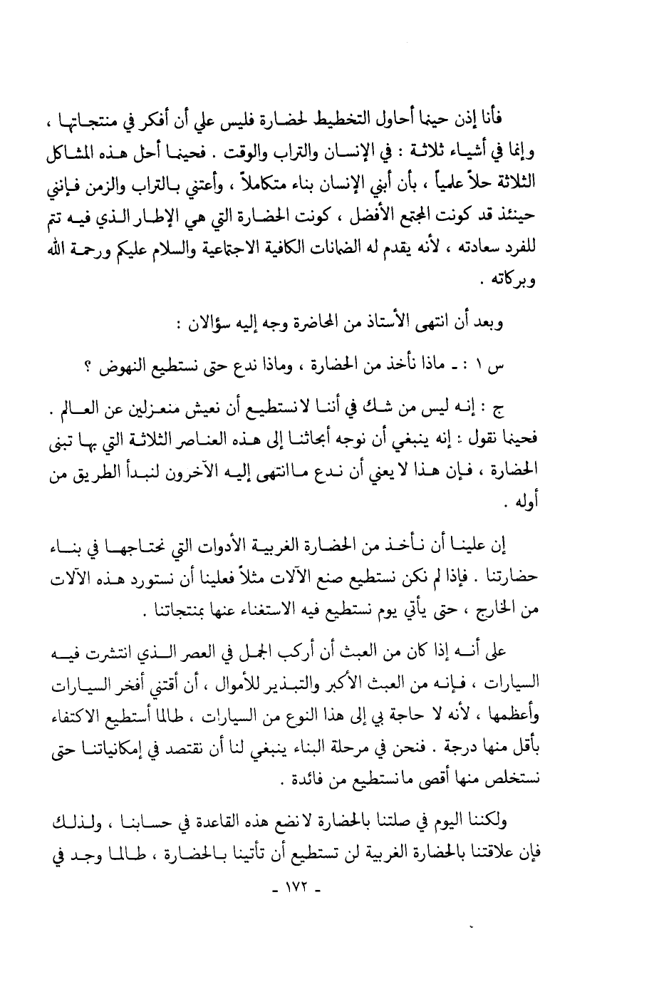 فأنا إذن حينما أحاول التخطيط لحضارة فليس علي أن أفكر في منتجاتها، وإنما في أشياء ثلاثة: في الإنسان والتراب والوقت. فحينما أحل هذه المشاكل الثلاثة حلا علميا، بأن أبني الإنسان بناء متكاملاً، وأعتني بالتراب والزمن فإنني حينئذ قد كونت المجتمع الأفضل، كونت الحضارة التي هي الإطار الذي فيه تتم للفرد سعادته، لأنه يقدم له الضمانات الكافية الاجتماعية والسلام عليم ورحمة الله وبركاته.