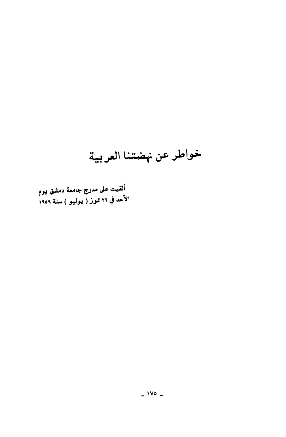 ألقيت على مدرج جامعة دمشق يوم الاحد في 26 تموز (يوليو) سنة 1959