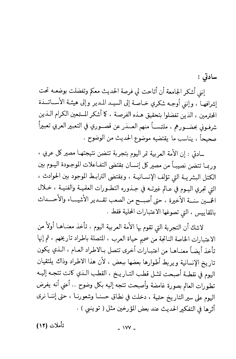 لاشك أن التجربة التي تقوم بها الأمة العربية اليوم، تأخذ معناها أولاً من الاعتبارات الخاصة الناتجة من صميم حياة العرب، المتصلة باطراد تاريخهم، ثم إنها تأخذ أيضاً معناها من اعتبارات أخرى تتصل بالاطراد العام، الذي يكون تاريخ الإنسانية ويربط أطوارها بعضها ببعض، لأن هذا الاطراد وذاك يلتقيان اليوم في نقطة أصبحت تمثل قطب التاريخ، القطب الذي كانت تتجه إليه تطورات العالم بصورة غامضة وأصبحت تتجه إليه بكل وضوح .. أعني أنه يفرض اليوم على سير التاريخ حتمية، دخلت في نطاق حسنا وشعورنا، حتى إننا نرى أثرها في التفكير الحديث عند بعض المؤرخين مثل (توينبي).