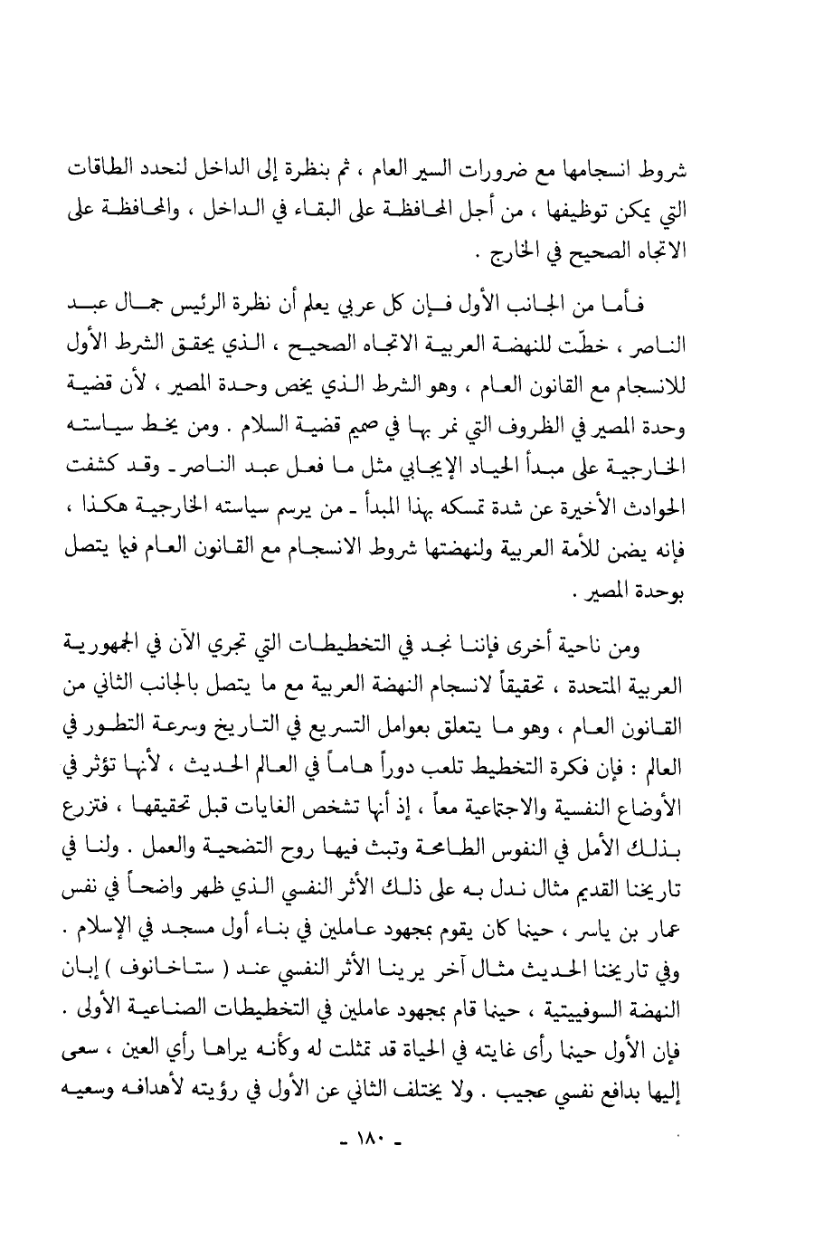 ومن ناحية أخرى فإننا نجد في التخطيطات التي تجري الآن في الجمهورية العربية المتحدة، تحقيقاً لانسجام النهضة العربية مع ما يتصل بالجانب الثاني من القانون العام، وهو ما يتعلق بعوامل الشريع في التاريخ وسعة التطور في العالم: فإن فكرة التخطيط تلعب دوراً هاماً في العالم الحديث، لأنها تؤثر في الأوضاع النفسية والاجتماعية معا، إذ أنها تشخص الغايات قبل تحقيقها، فتزرع بذلك الأمل في النفوس الطامحة وتبث فيها روح التضحية والعمل. ولنا في تاريخنا القديم مثال ندل به على ذلك الأثر النفسي الذي ظهر واضحاً في نفس عمار بن ياس، حينما كان يقوم بمجهود عاملين في بناء أول مسجد في الإسلام. وفي تاريخنا الحديث مثال آخر يرينا الأثر النفسي عند (ستاخانوف) إبان النهضة السوفييتية، حينما قام بمجهود عاملين في التخطيطات الصناعية الأولى.