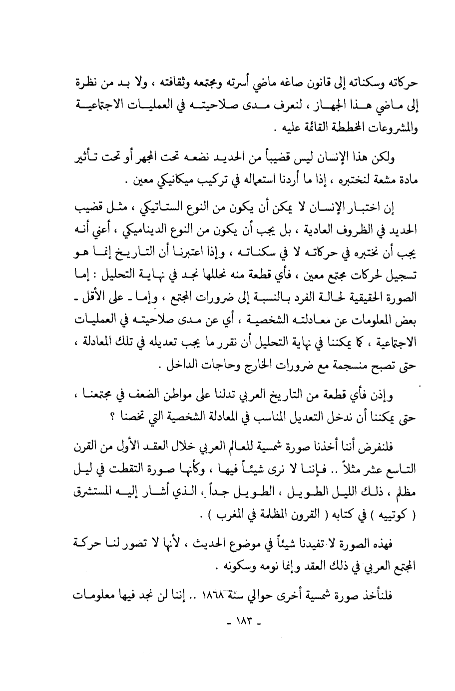 إن اختبار الإنسان لا يمكن أن يكون من النوع الستاتيكي، مثل قضيب الحديد في الظروف العادية، بل يجب أن يكون من النوع الديناميكي، أعني أنه يجب أن نختبره في حركاته لا في سكناته، وإذا اعتبرنا أن التاريخ إنما هو تسجيل لحركات مجتمع معين، فأي قطعة منه نحللها نجد في نهاية التحليل: إما الصورة الحقيقية لحالة الفرد بالنسبة إلى ضرورات المجتمع، وإما- على الأقل- بعض المعلومات عن معادلته الشخصية، أي عن مدى صلاحيته في العمليات الاجتماعية، كما يمكننا في نهاية التحليل أن نقرر ما يجب تعديله في تلك المعادلة، حتى تصبح منسجمة مع ضرورات الخارج وحاجات الداخل.