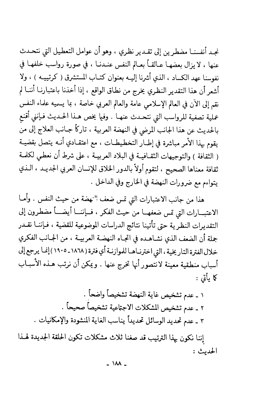 نجد أنفسنا مضطرين إلى تقدير نظري، وهو أن عوامل التعطيل التي نتحدث عنها، لا يزال بعضها عالقاً بعالم النفس عندنا، في صورة رواسب خلفها في نفوسنا عهد الكساد، الذي أشرنا إليه بعنوان كتاب المستشرق (كرتييه)، ولا أشعر أن هذا التقدير النظري يخرج من نطاق الواقع، إذا أخذنا باعتبارنا أننا لم نقم إلى الآن في العالم الإسلامي عامة والعالم العربي خاصة، بما يسميه علماء النفس عملية تصفية للرواسب التي نتحدث عنها. وفيما يخص هذا الحديث فإنني أقنع بالحديث عن هذا الجانب المرضي في النهضة العربية، تاركا جانب العلاج إلى من يقوم بهذا الأمر مباشرة في إطار التخطيطات، مع اعتقادي أنه يتصل بقضية (الثقافة) والتوجيهات الثقافية في البلاد العربية، على شرط أن نعطي لكلمة ثقافة معناها الصحيح، لتقوم أولا بالدور الخلاق للإنسان العربي الجديد، الذي يتواءم مع ضرورات النهضة في الخارج وفي الداخل.