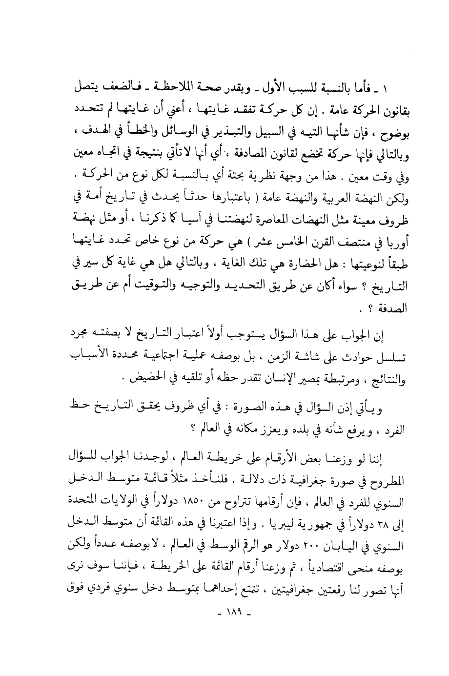 1 - فأما بالنسبة للسبب الأول- وبقدر صحة الملاحظة- فالضعف يتصل بقانون الحركة عامة. إن كل حركة تفقد غايتها، أعني أن غايتها لم تتحدد بوضوح، فإن شأنها التيه في السبيل والتبذير في الوسائل والخطأ في الهدف، وبالتالي فإنها حركة تخضع لقانون المصادفة، أي أنها لا تأتي بنتيجة في اتجاه معين وفي وقت معين. هذا من وجهة نظرية بحتة أي بالنسبة لكل نوع من الحركة. ولكن النهضة العربية والنهضة عامة (باعتبارها حدثاً يحدث في تاريخ أمة في ظروف معينة مثل النهضات المعاصرة لنهضتنا في آسيا كما ذكرنا، أو مثل نهضة أوربا في منتصف القرن الخامس عشر) هي حركة من نوع خاص تحدد غايتها طبقاً لنوعيتها: هل الحضارة هي تلك الغاية، وبالتالي هل هي غاية كل سير في التاريخ؟ سواء أكان عن طريق التحديد والتوجيه والتوقيت أم عن طريق الصدفة؟.